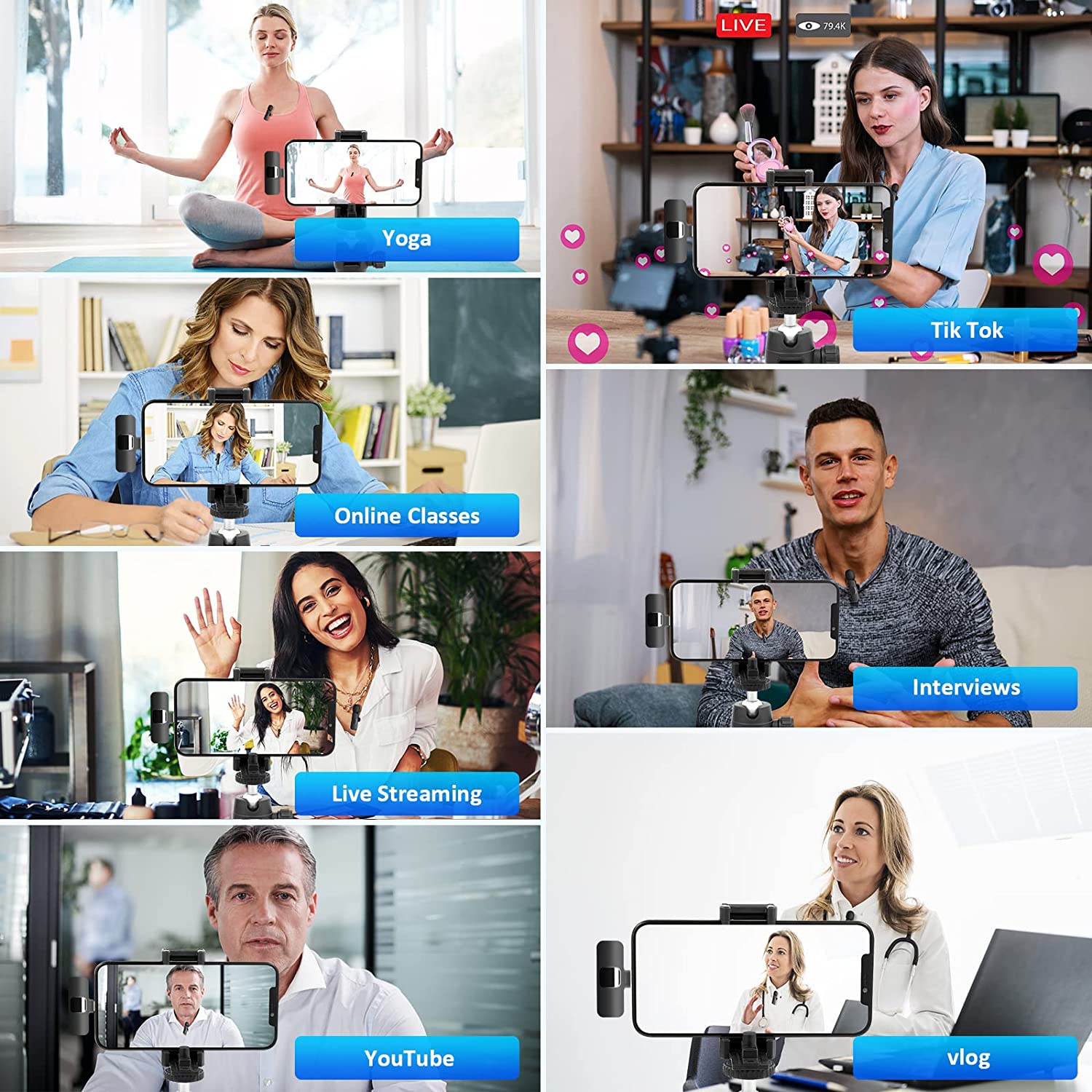 ?【Easy Automatic Connection】No need for cable/APP/Bluetooth, just 2 steps to connect. Step ①: Plug the receiver of wireless lavalier microphone into your device; Step ②: Power on the microphone. Say goodbye to messy cables, the wireless microphone for iPhone can be clipped on the collar, freeing your hands for interviewing, vlogging, live streaming, or podcasting.