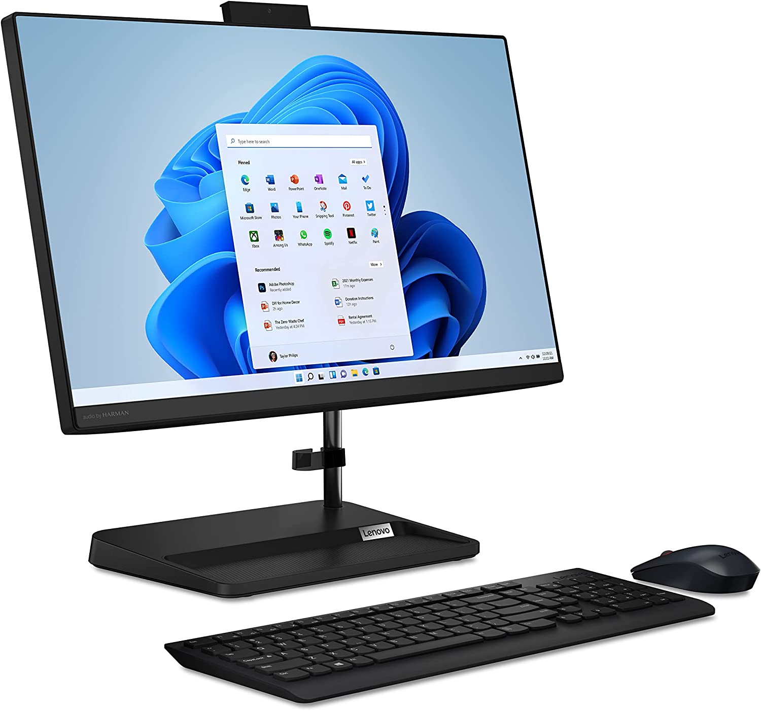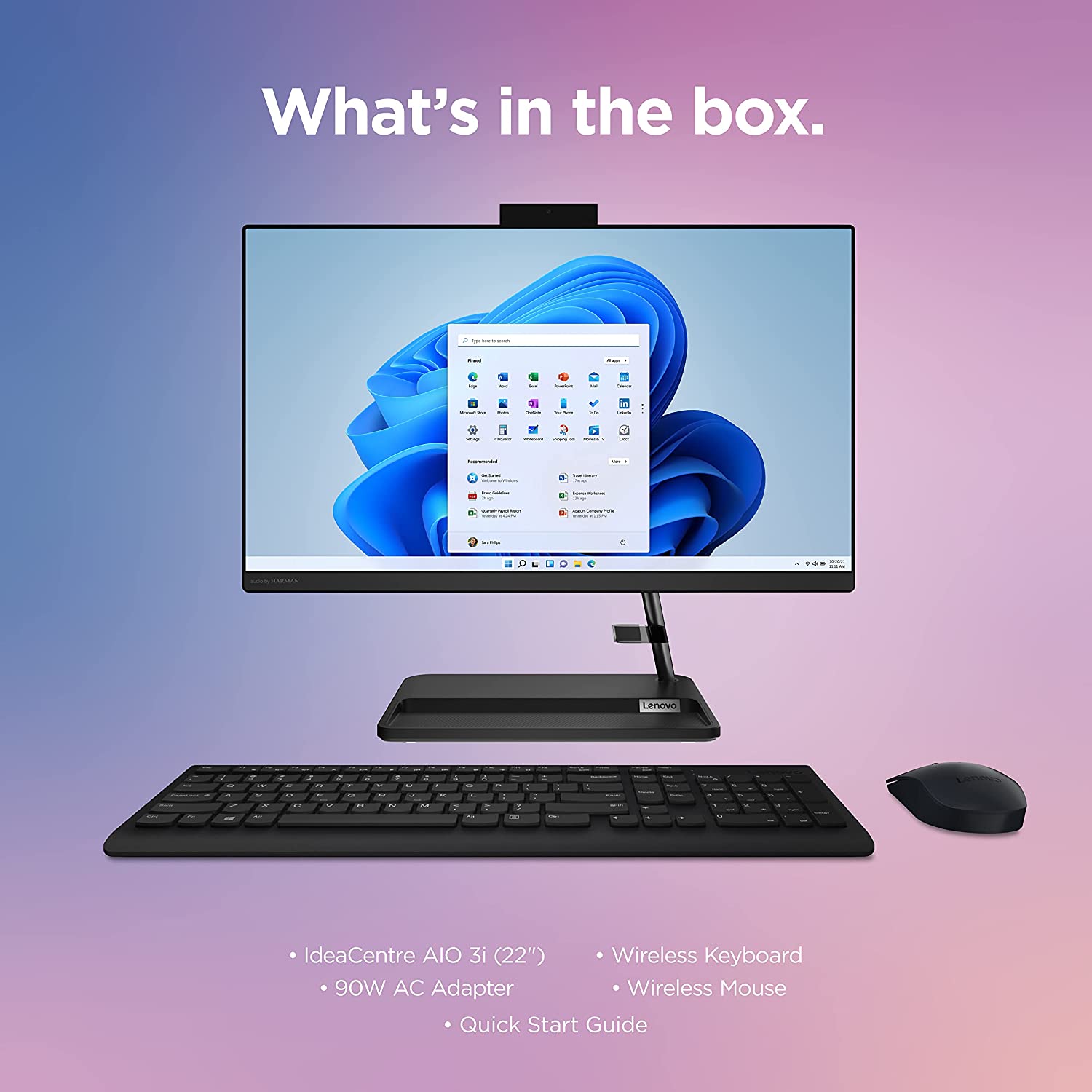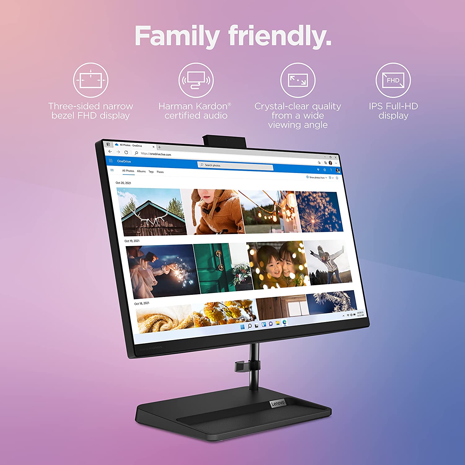 The IdeaCentre AIO 3i desktop computer is designed to perform and impress. This all-in-one computer is a pint-sized powerhouse, packing a wallop inside a compact chassis. Great things do come in the smallest packages, and housed in a sleek and compact frame, the Lenovo IdeaCentre AIO 3i delivers peak performance an 11th generation Intel® Core™ i3 processor, along with lightning-fast file transfer and boot times thanks to its 256GB SSD. Three-sided narrow bezels on the 22-inch FHD display and Harman®-certified stereo speakers make this the consummate family PC. It's great for personal productivity, working from home, or your child's schoolwork.Your household now has a store for its vast media library. Amass hundreds of movies and thousands of songs or videos with 256GB solid-state disk storage, which offers faster boot times, file transfers, and system responsiveness. Watch all of your favorites on the wide-angle full HD (1920 x 1080) touchscreen display, which also gives you more options for intuitive interaction with your computer - clicking and dragging files is easier than ever. This convenient AIO PC is made to make connecting simple, with a built-in webcam for videoconferencing and video chats that you can shut down for privacy. You'll also connect with wireless LAN (2x2 802.11 ac) and Bluetooth® combo card, plus multiple USB 2.0 and 3.2 ports, 1000 LAN, and HDMI™-out.