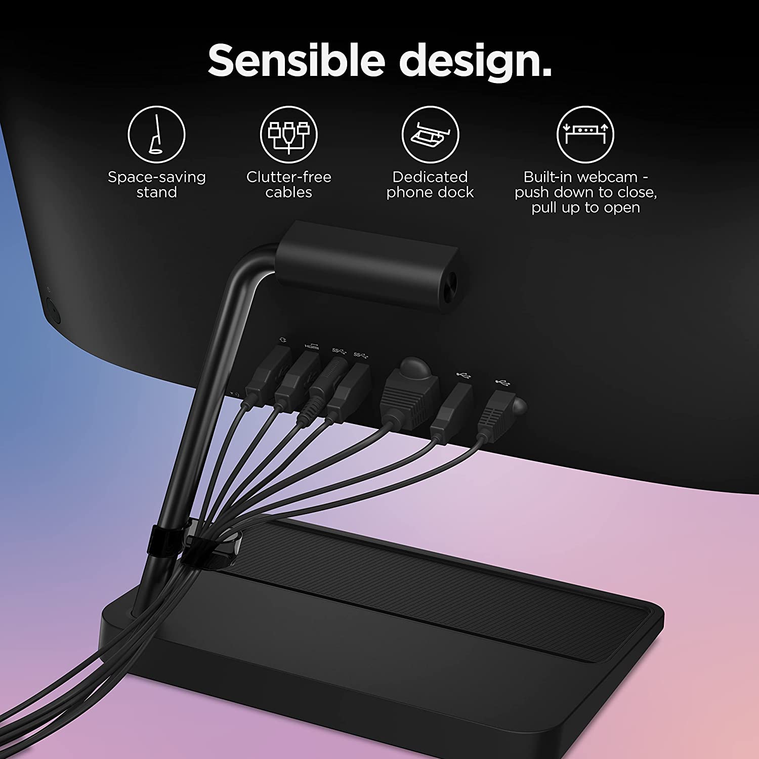 • This slim and compact all-in-one computer has a stand for your mobile phone, and the sleek design hides a camera with up to 5M clarity to make video conferencing more real and enjoyable; wireless keyboard and mouse included