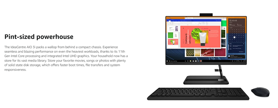 • The IdeaCentre AIO 3i delivers blazing performance on even the heaviest workloads, thanks to its up-to Intel Core i3-1115G4 processor, 8GB DDR4 RAM, and 256GB solid-state disk storage