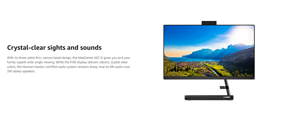• With a three-sided thin and narrow bezel design, the IdeaCentre AIO 3i offers wide-angle viewing on a Full-HD touchscreen display for vibrant colors in crystal-clear quality