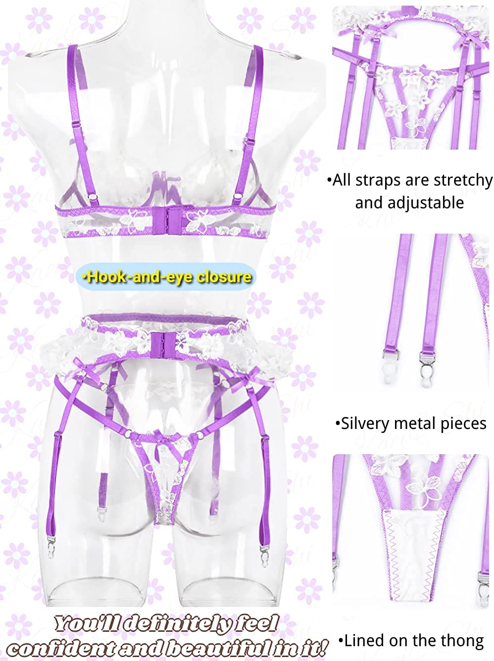 ✿Style: This underwire ruffle lingerie set with flower embroidered lace overlay and satin bow decor can enhance femininity and outline sexy breast lines.