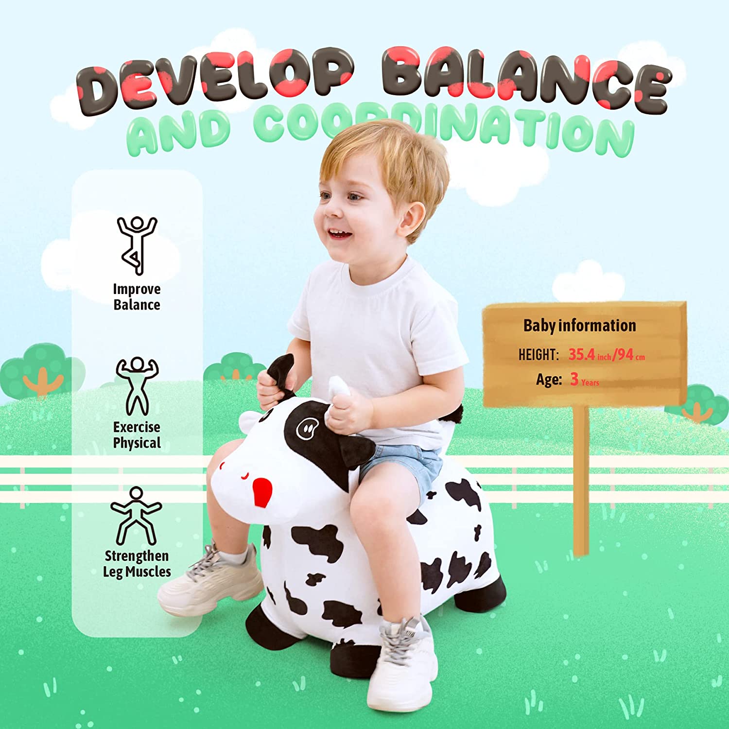 - ECO-FRIENDLY AND SAFE: Our bouncy cow are Phthalates, lead, BPA, and heavy metal-free, making them safe for your child to use. They have been tested for compliance with the ASTM F963-11 Toy Safety Standards, so you can trust that your child is safe while using our animal hopper.