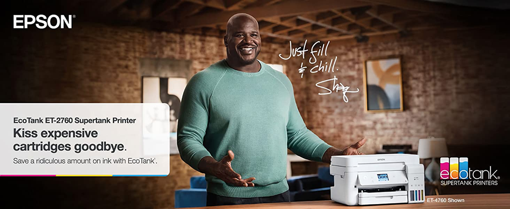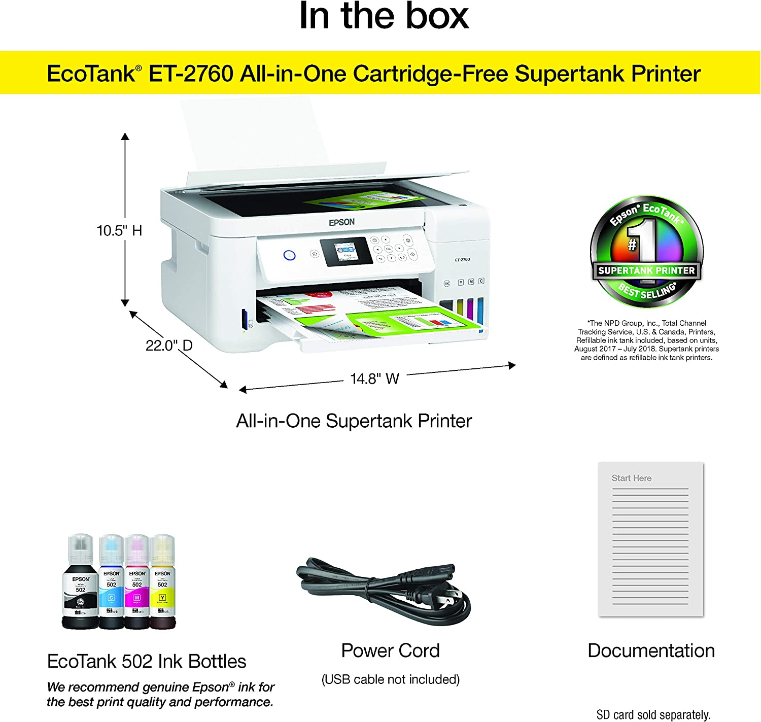 The Eco Tank ET-2760 offers Cartridge-Free Printing with easy-to-fill supersized ink tanks You can save up to 90 percent with low-cost replacement ink bottles ― costing as little as 1 cent per color ISO page versus 20 cents with ink cartridges (1) Plus you can get up to 2 years of ink with the included or a replacement ink set (2) Each replacement ink bottle set includes enough ink to print up to 7 500/6 000 pages (bk/clr)(3) ― equivalent to about 80 individual cartridges (4) That means less waste and fewer trips to the store Exclusive uniquely keyed Eco Fit bottles make it easy to fill each color tank You also get auto 2-sided printing and copying a 1 44" color display and wireless connectivity *The NPD Group Total Channel Tracking Service U S & Canada Inkjet SF/MF Printers Refillable ink tank included based on units February 2019 - January 2020 Supertank printers are defined as refillable ink tank printers 1 Savings and cost per ISO page are based on the cost of replacement ink bottles and the cost of enough standard cartridges to achieve the total page yields of the bottles using the MSRP (USD) and yields for Epson standard-capacity ink cartridges for similarly featured Epson consumer inkjet printers as of February 2019 Actual savings and costs will vary considerably based on print tasks print volumes and usage conditions 2 Based on average monthly document print volumes of about 150 pages 3 Part of the ink from the included bottles is used for initial setup yields are lower than those of replacement ink bottles Replacement and included ink bottle yields based on the ISO/IEC 24712 pattern with Epson’s methodology Actual ink yields will vary considerably for reasons including images printed print settings temperature and humidity Yields may be lower when printing infrequently or predominantly with one ink color All ink colors are used for printing and printer maintenance and all colors must be available for printing For more information visit our official site 4 Individual cartridges estimate based on print yields of a replacement set of Black and color ink bottles as compared to Epson standard-capacity ink cartridges for similarly featured printers as of September 2018 5 Most features require an Internet connection to the printer as well as an Internet- and/or email-enabled device For a list of Epson Connect enabled printers and compatible devices and apps visit our official site 6 Wi-Fi CERTIFIED level of performance subject to the range of the router being used Wi-Fi Direct may require printer software 7 Adapter may be required 8 Voice-activated printing is not available with the Epson Expression Eco Tank ET-2500 and ET-2550 printers and Epson printers that are 5 or more years old See our official site for device compatibility Epson Connect account and voice-activated account registration required 9 12 months of standard limited or 50 000 plain paper sheets (whichever happens first) For an additional 12-month extended service plan (total of 24 months or 50 000 plain paper sheets whichever happens first) you must register your product and use Epson genuine ink bottles See Limited for details 10 ET-2600/2700/3700/4700/7700/16000 Series and ST-2000/3000/4000 Series included ink bottle yields based on the ISO/IEC 24712 pattern with Epson’s methodology ET-7700 Series included ink bottle photo yields are significantly lower ET-8700 included ink pack yields are estimated based on ISO/IEC 24711 test in Default Mode printing continuously Actual ink yields will vary considerably for reasons including images printed print settings temperature and humidity Yields may be lower when printing infrequently or predominantly with one ink color All ink colors are used for printing and printer maintenance and all colors must be available for printing For more information visit our official site 11 For convenient and reasonable recycling options visit our official site 12 Smart Way is an innovative partnership of the U S Environmental Protection Agency that reduces greenhouse gases and other air pollutants and improves fuel efficiency.