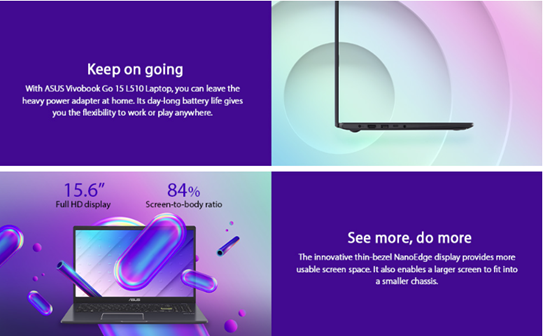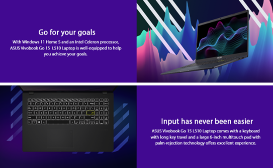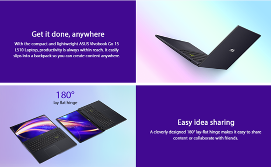 • Easy Sharing: A cleverly designed 180° lay-flat hinge on the ASUS Vivobook Go 15 makes it easy to share content or collaborate with friends