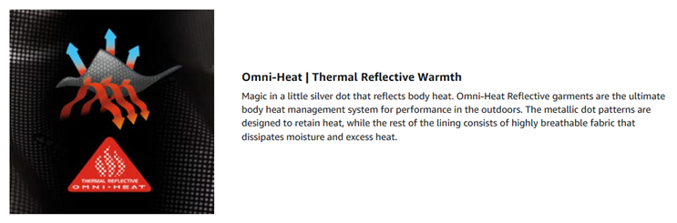 • OMNI-HEAT: Our patented Heat Reflective garments are the ultimate body heat management system for outdoor performance. The interior lining consists of our metallic dot pattern designed to retain heat, while the breathable fabric dissipates moisture.