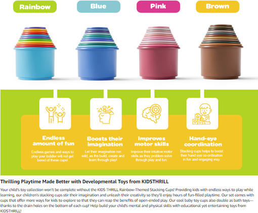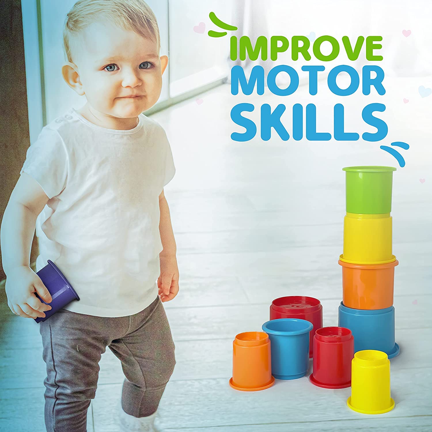 • Educational Toddler Toys. When Stacked Together, Our toys for babies Stacking Cups baby Toy Add Up To An Astonishing 63.5cm Tower That Your Little One Will Love. The ten pcs Baby Bath toy Cups Come In A Wide Range Of rainbow Colors That Will Instantly Grab Your Kid’s Attention.