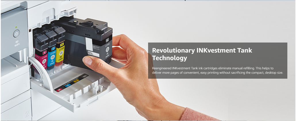 • THE BROTHER REVOLUTIONARY INKVESTMENT TANK SYSTEM: Brother INKvestment Tank printers feature reengineered ink cartridges that hold more ink and deliver a continuous ink supply to the internal tank for truly convenient, uninterrupted printing.