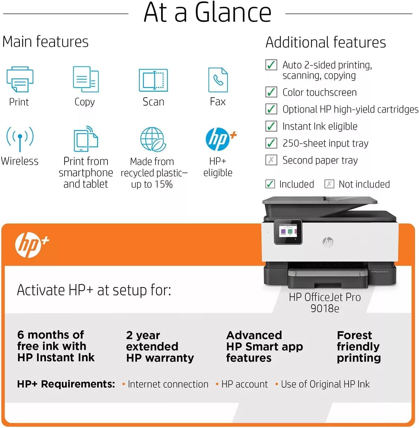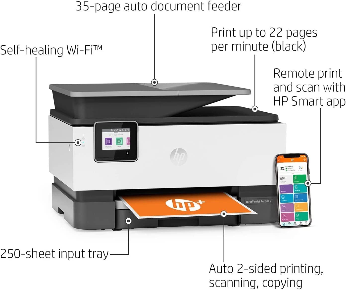 HP OfficeJet Pro 9018e All-in-One Wireless Color Inkjet Printer - Print Scan Copy Fax - 22 ppm, 4800 x 1200 dpi, 512MB Memory, 35-Sheet ADF, Auto 2-Sided Printing, Ethernet (Renewed)