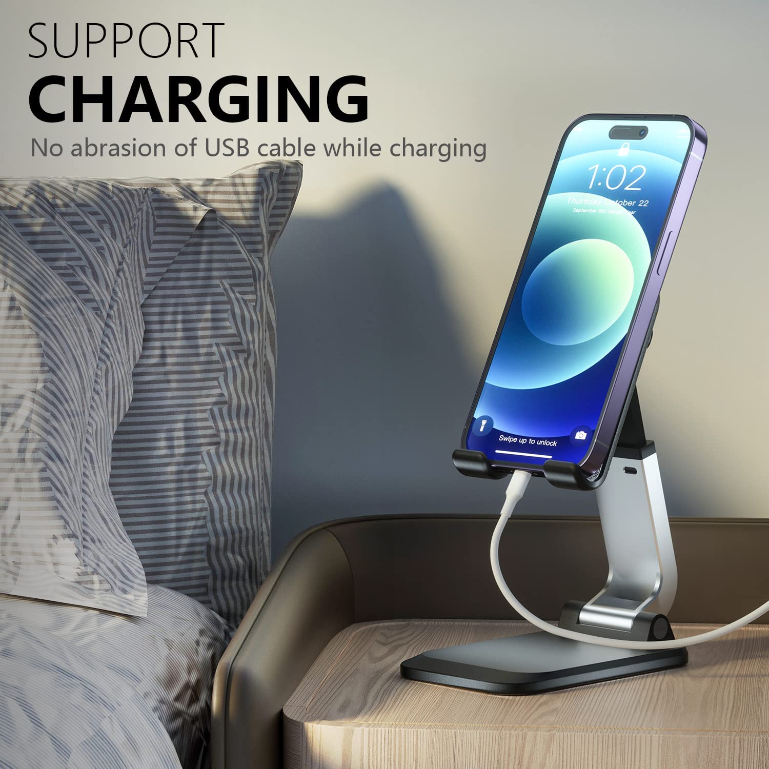 • [Considerate Design] 2 Pack Phone Stand for desk. Compact and sturdy, this phone stands a reserved charging port so you can keep the charger plugged in while watching. Be your desk accessory. Suitable for many occasions. Make your life more convenient in the kitchen, dining table, nightstand, or office