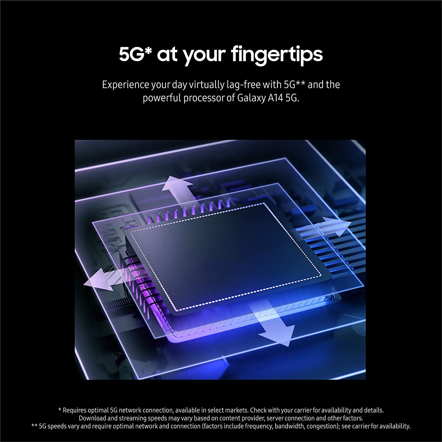 • 5G AT YOUR FINGERTIPS: Enjoy playing games and streaming with virtually lag-free 5G** and the fast, reliable processor of Galaxy A14 5G; Download and share content quickly with a phone that keeps up with the speed of life