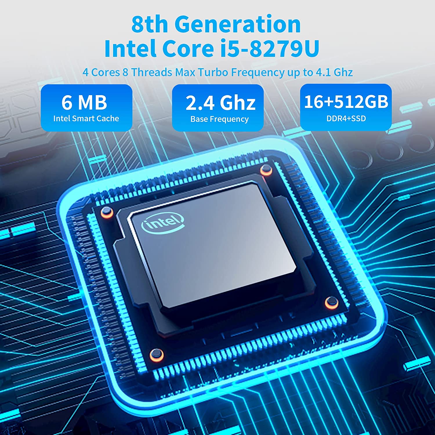 • 【Powerful Processor Intel i5-8279U】Mini PC comes with Intel Coffee Lake i5-8279U(2.4GHz, Turbo 4.1Ghz, 4 Cores 8 Threads, supports 6M Intel Smart Cache). With better stability, smoothness and power saving, this mini PC can satisfy your scenarios' use in office,education industry,entertainment and gaming etc .