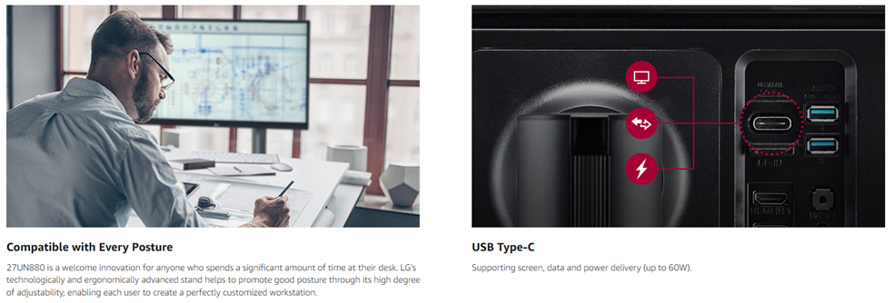 LG 27UN880-B Ultrafine Monitor 27” UHD (3840 x 2160) IPS Display, sRGB 99% Color Gamut, VESA DisplayHDR 400, USB Type-C, Ergo Stand - Black