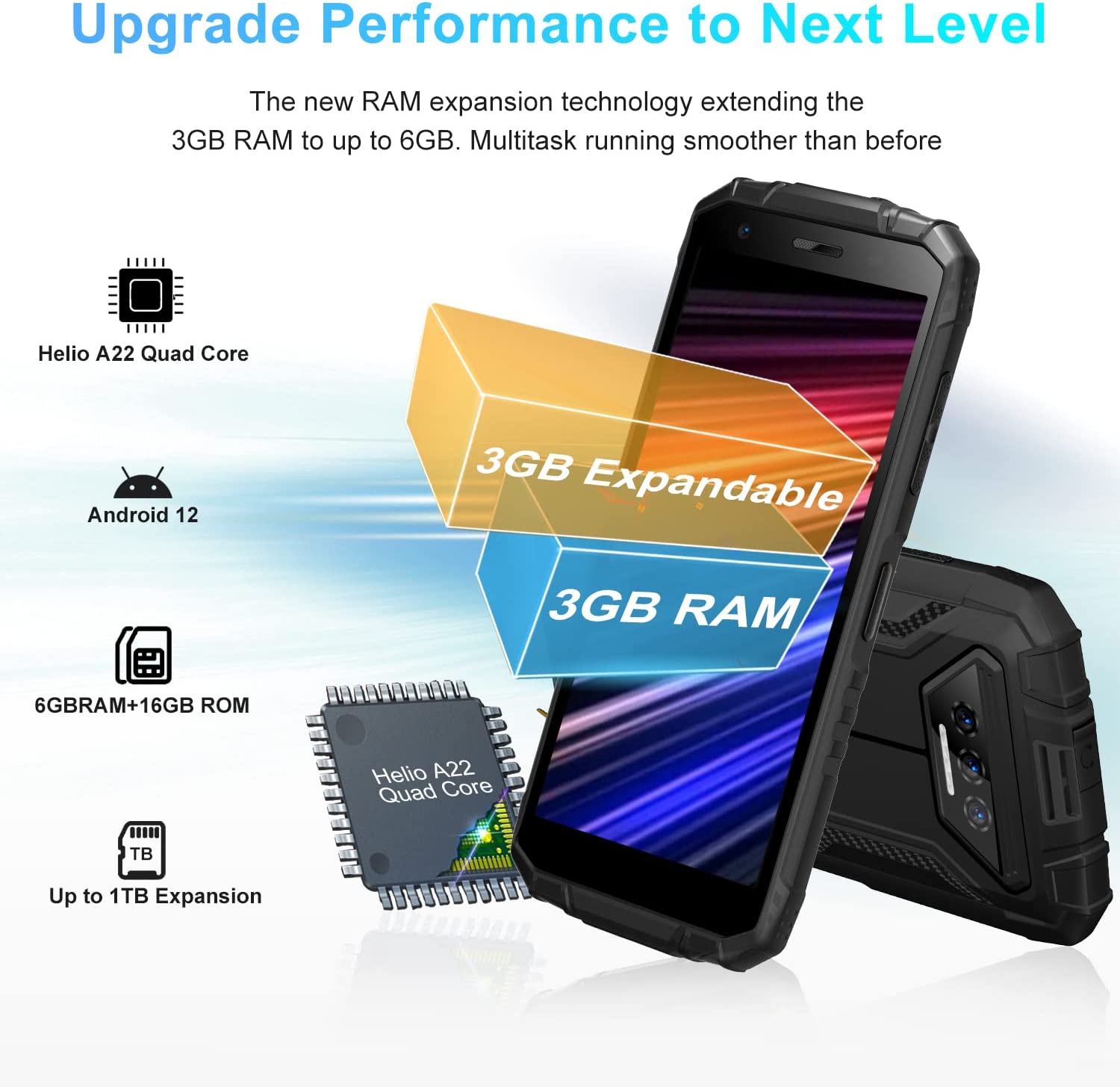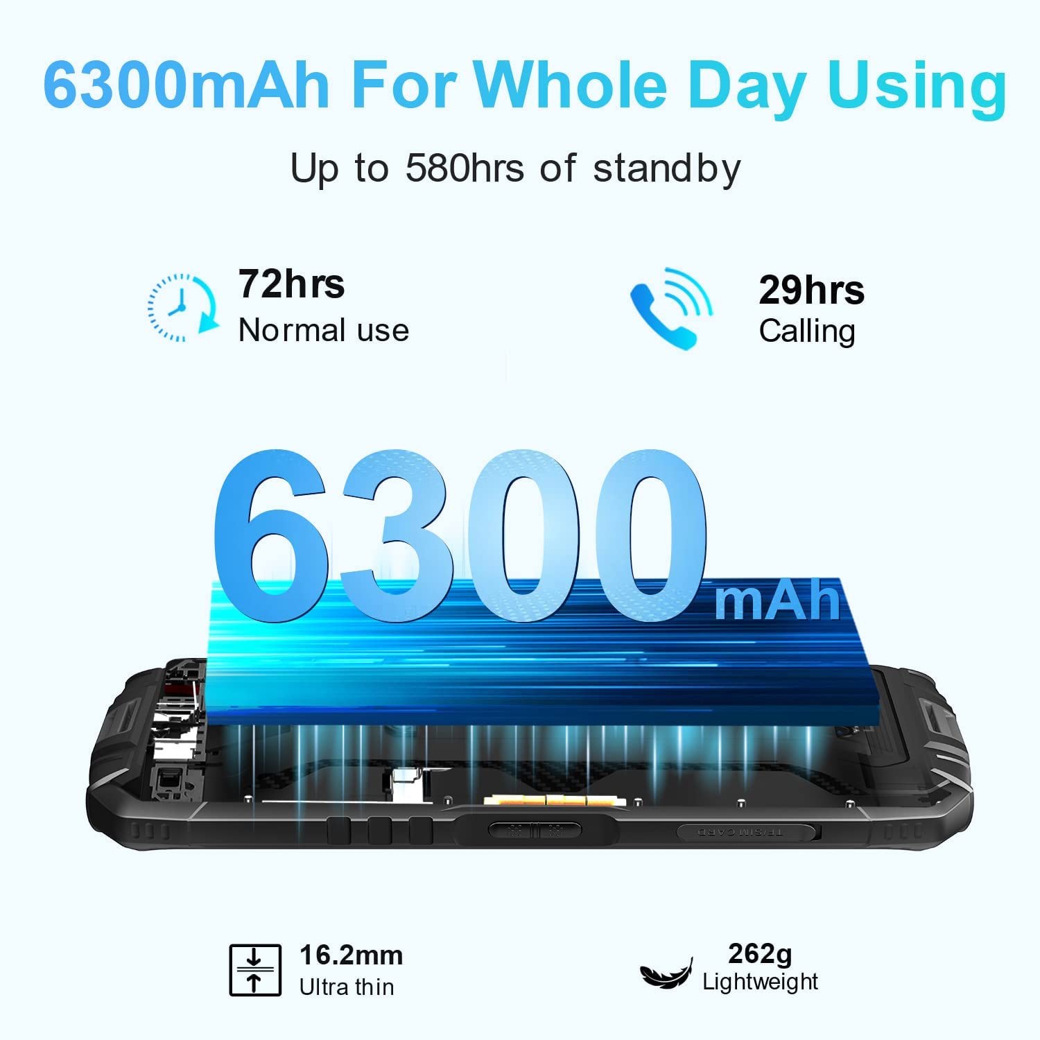 • ?【6300mAh Larger Battery】Rugged phones unlocked is equipped with a 6300mAh battery and turns out to be a strong powerhouse that continuously powers you up, living up to more than a day of regular use. It can provide 580hrs Standby, 72 hrs Normal Use, 29 hrs Call, 32 hrs Music, and 11 hrs Video(Lab data). Intelligent and thoughtful AI battery management can reduce excessive cache to save more power and longer standby time.