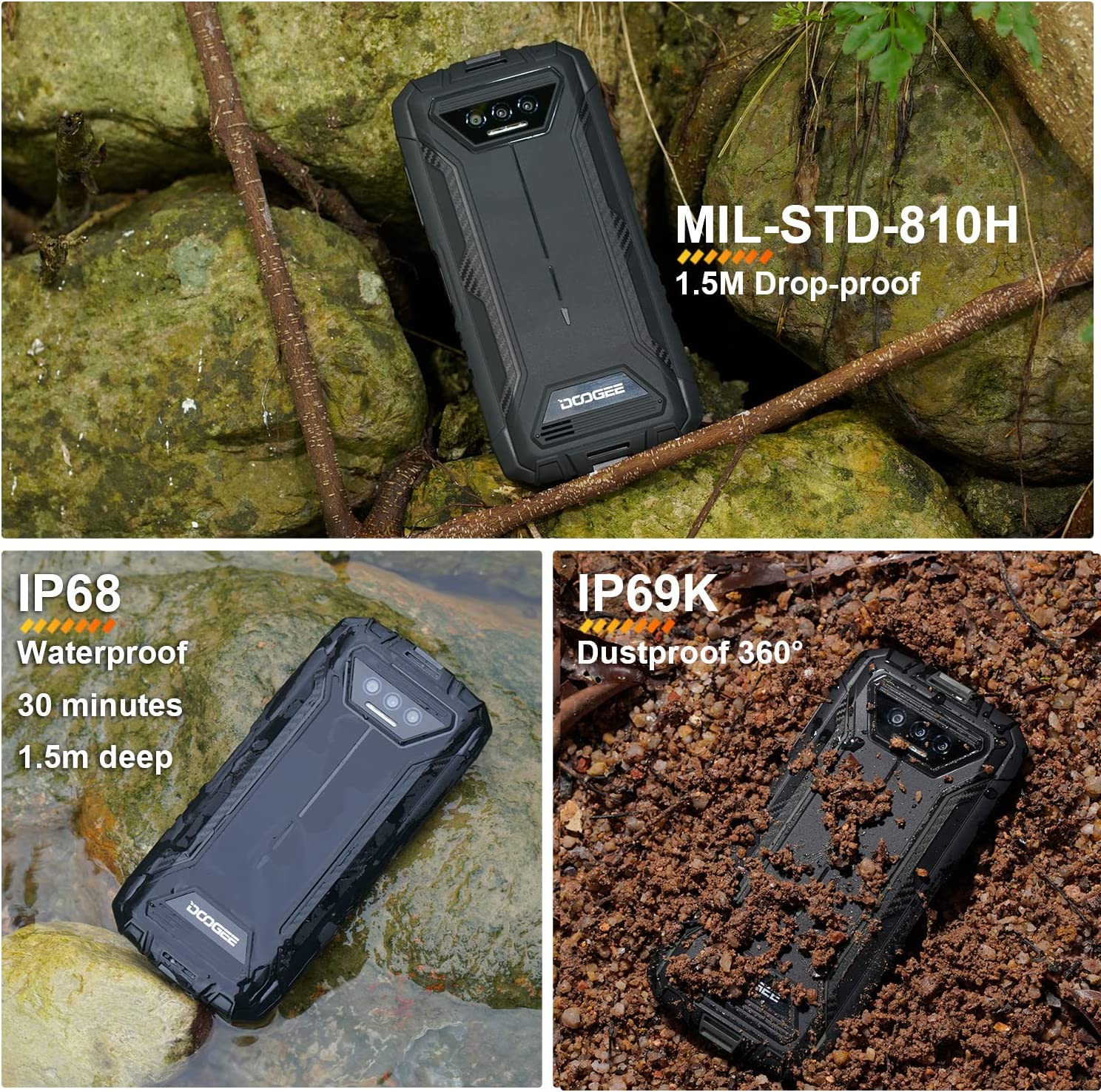 • ☔【Tougher Smartphone Than Expected】DOOGEE S41 rugged smartphone is made of tough stuff and complies with harsh environments using standards which is passed IP68/IP69K and MIL-STD-810H tests outstandingly. Feature excellent protective military grade cell phone is worry free on dropping from 6FT height onto the ground, fully submerging into 4FT depth water 30mins, dusty or sandy complete covering.