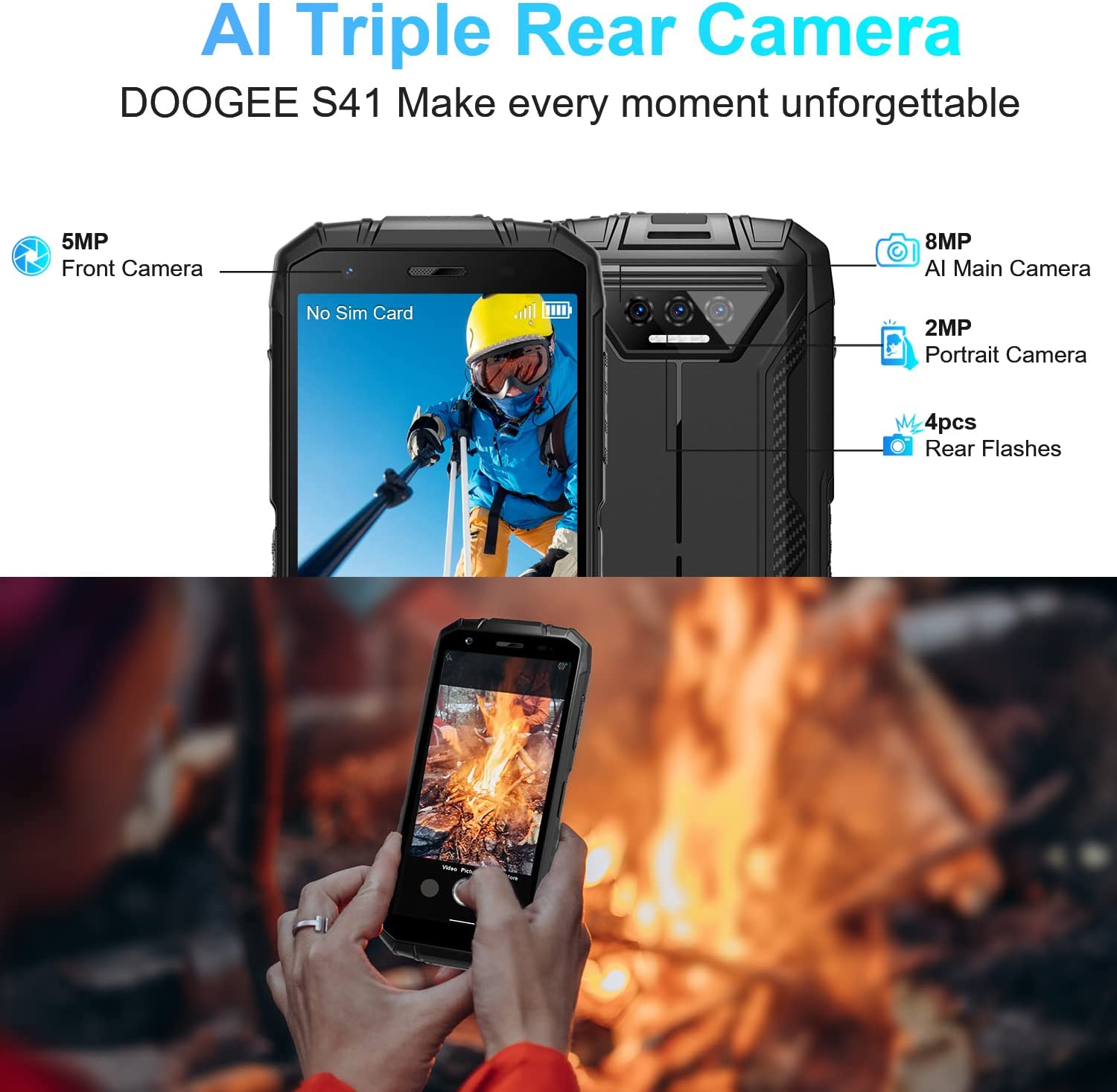 • ?【Triple Camera System】DOOGE S41 rugged smartphones with 8MP+2MP+2MP Triple Rear Cameras, allowing you to freely capture the moments and beauty of the world. and stunning selfies with a 5MP front-facing camera to capture crisp moment.