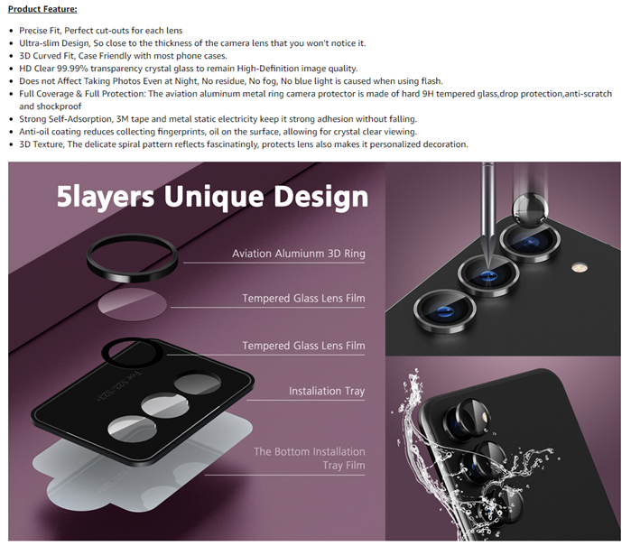 - 【Compatibility】The Camera Protector Samsung Galaxy S23 Plus is designed for Samsung Galaxy S23 and Samsung Galaxy S23 Plus. Please confirm your mobile phone model before purchasing.