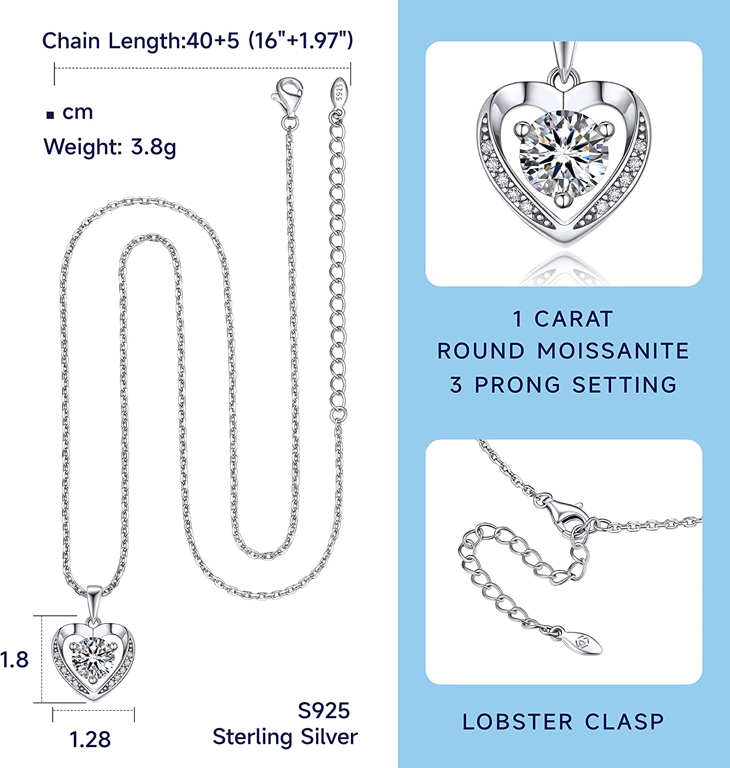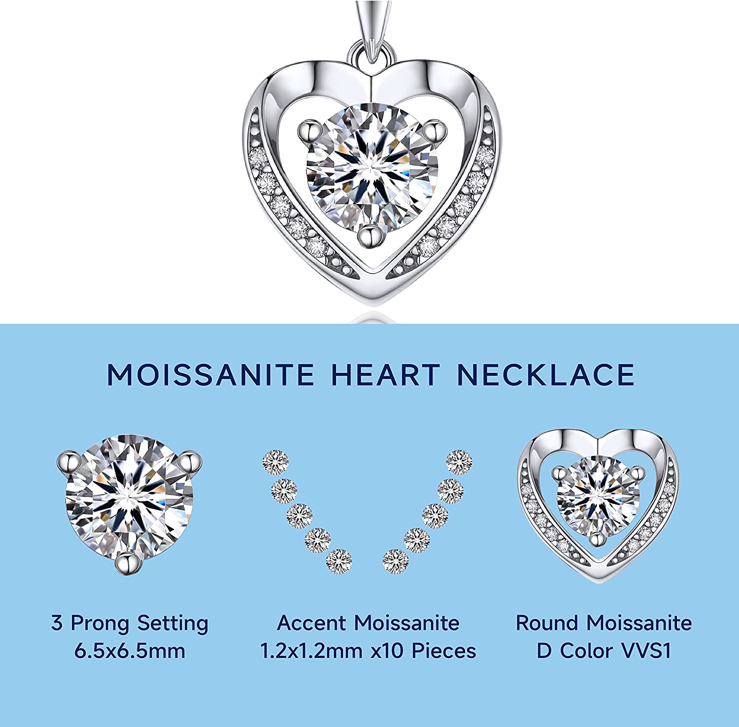 • ❤️【Dainty Heart Pendant Necklace】 ➣ This heart necklaces for women is a perfect expression of love. Features a round brilliant cut centre moissanite 6.5mm/1ct 3 prong setting. With 10 accent moissanite. this pendant is suspended from a well-crafted S925 sterling silver chain necklace that can be worn at 16 or 18 inches.