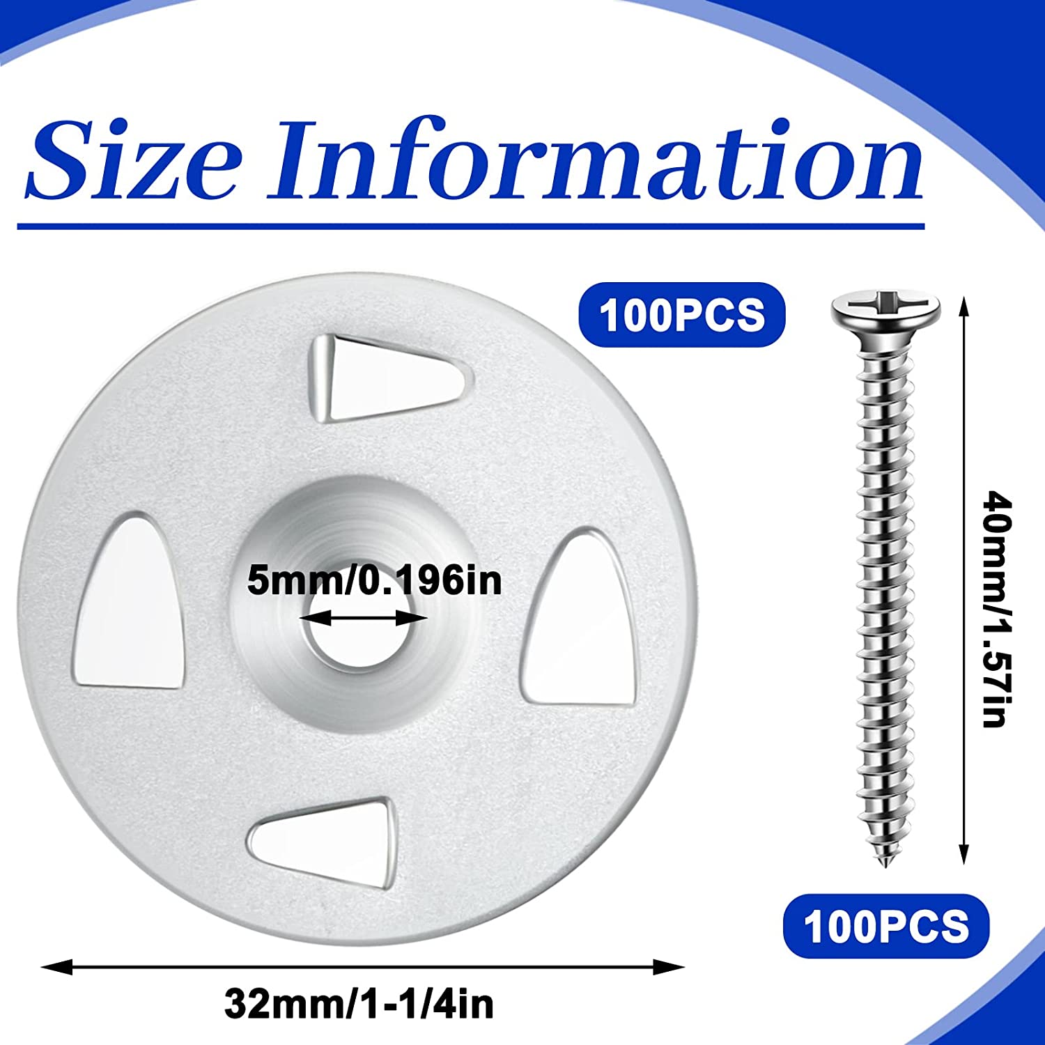 Sufficient Quantity: you will receive 100 pieces of stainless steel washers with a diameter of 1-1/4 inches, and 100 pieces of stainless steel self tapping screws with a size of about 0.14 x 1.57 inches/ 3.5 x 40 mm; The abundant quantity can meet your various use and replacement needs
