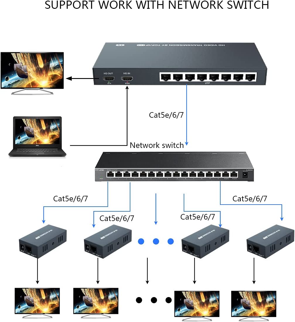 - Ultra-Long Distance: transmit HDMI audio/video signal up to 150 meters via Ethernet Cat6/7, Cat5e---120m, Cat5--100m.