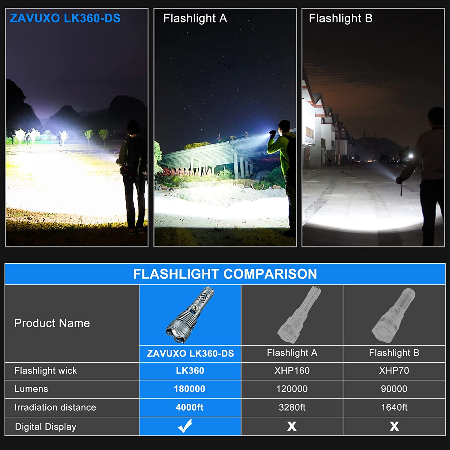 • ?【180000 LUMENS SUPER BRIGHT RECHARGEABLE FLASHLIGHT】LK360-DS rechargeable LED flashlights has a built-in LK360 upgrade chip, and it has a multi-functional protection board to prevent overcharging, overheating, overvoltage and short circuit, thus prolonging the life of the super bright flashlight. LK360-DS high lumens flashlight can produce a super high output of 180,000 lumens, and the maximum illumination distance can reach 4,000 feet. 30 times brighter than ordinary LED flashlights!