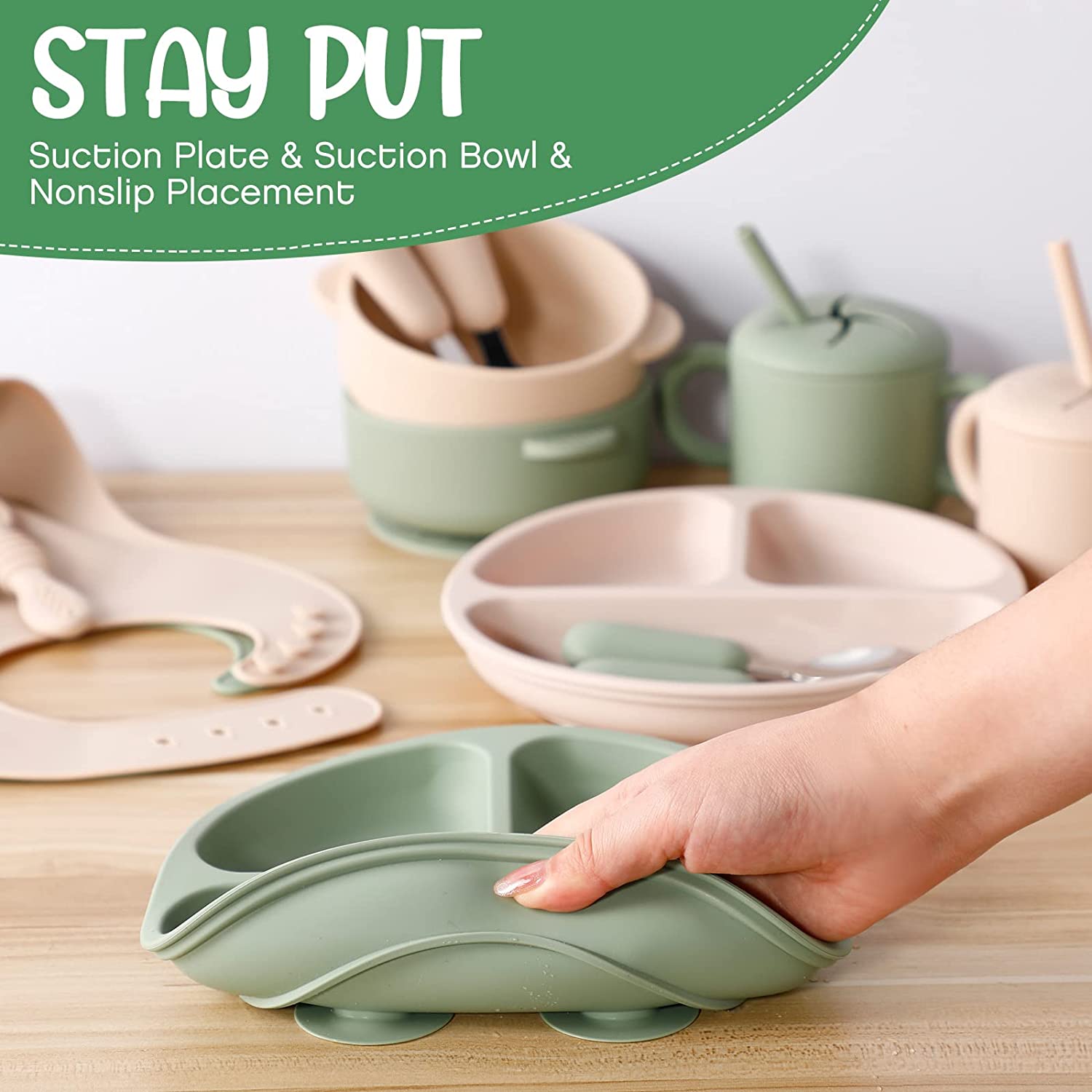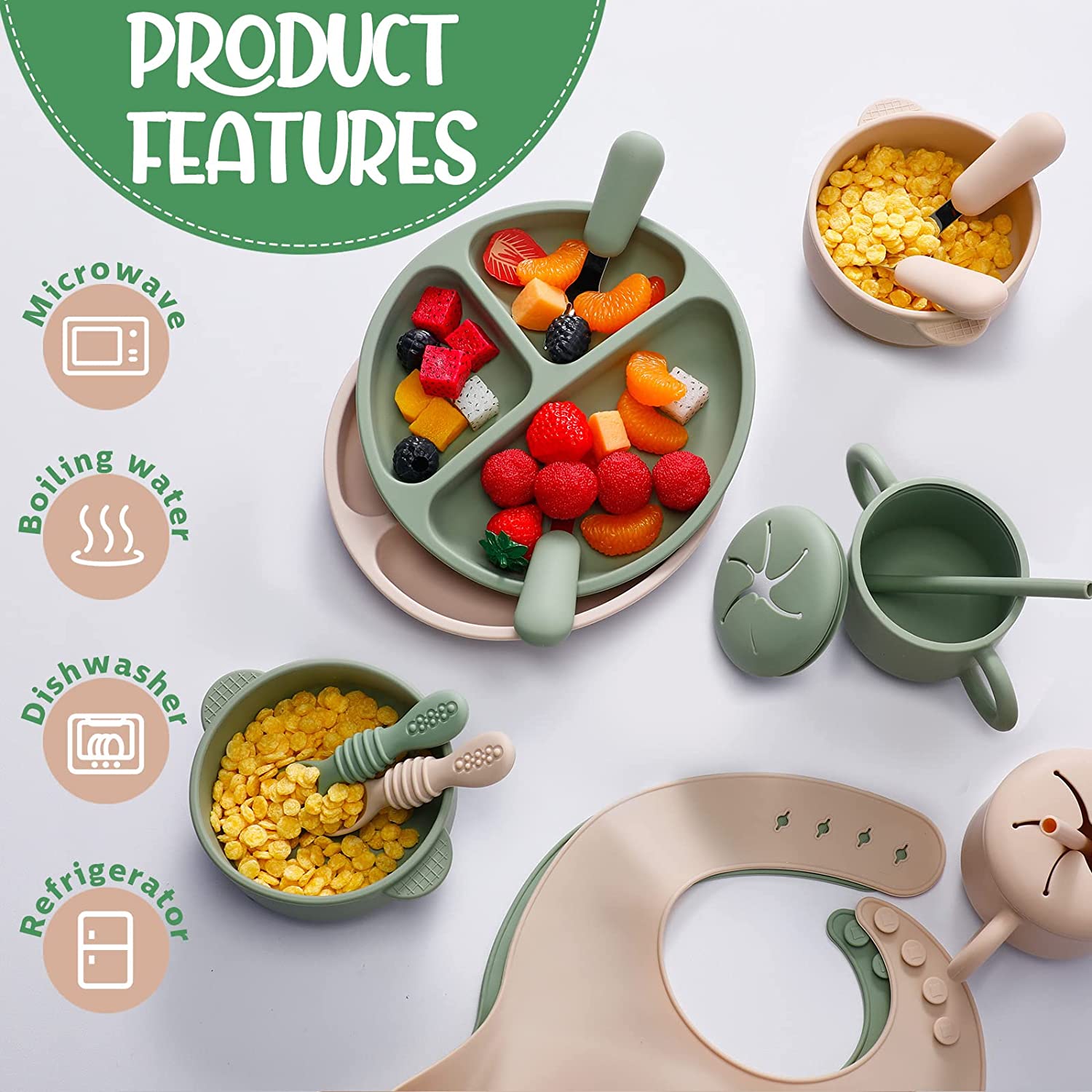 16 Pcs Silicone Baby Feeding Set Baby Led Weaning Supplies Baby Eating Supplies Utensils with Divided Silicone Suction Plates Adjustable Bib Bowl Cutlery Snack Cup Spoons Straw Green Beige 6 Months+