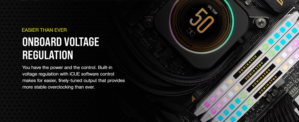 • Onboard Voltage Regulation: Makes for easier, finely-tuned, and more stable overclocking through CORSAIR iCUE software than ever.