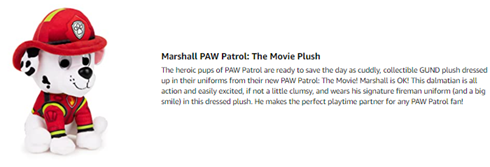• PAW PATROL: THE MOVIE MARSHALL PLUSH: Marshall’s movie-accurate firefighter uniform & soft hat are finely detailed & printed in rich jewel tones to bring the action off the big screen & into your living room!