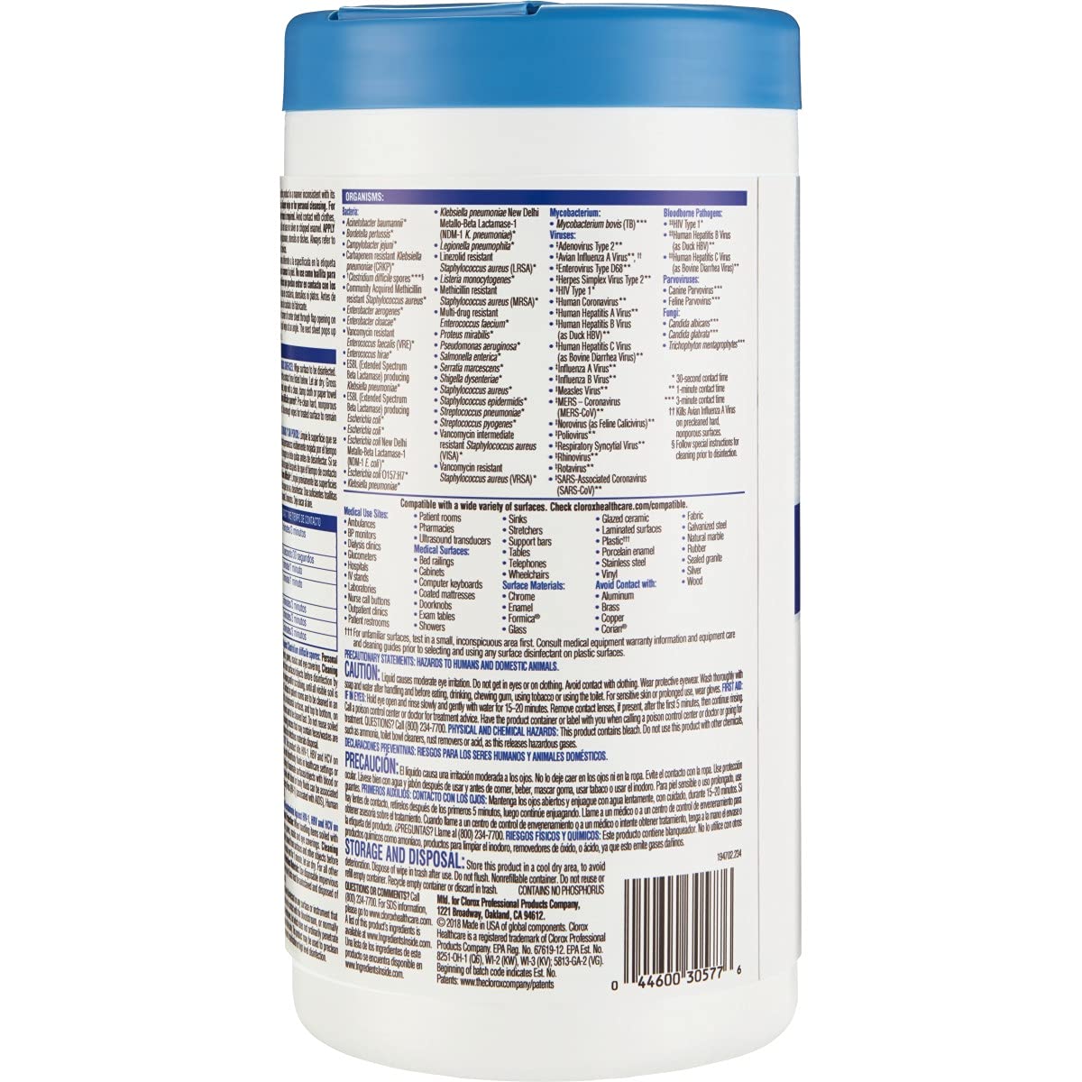 Healthcare professionals trust Clorox Healthcare Bleach Germicidal Wipes to help them overcome infection control challenges in a constantly changing healthcare environment. Clorox Healthcare Bleach Germicidal clinical wipes are ready to use, 1 step cleaner containing a 1:10 bleach dilution to meet CDC and OSHA guidelines for disinfecting surfaces in healthcare settings. Designed for daily disinfection, high-touch surfaces and medical equipment. These wipes are EPA registered to kill a total of 58 microorganisms, including HAI causing bacteria like MRSA and VRE in 30 seconds, outbreak causing viruses such as Influenza A and B viruses, Measles Virus and Norovirus in 1 minute and C. difficile spores, TB and fungi in 3 minutes. These wipes kill 99.9999% of C. difficile spores, according to the current EPA recommended testing standard (June 2014). These wipes are engineered minimize residue and leave less visible residue on surfaces vs. competitor bleach wipes. These 150 count, ready-to-use wipes are 6 inch by 5 inch size. They are formulated with an anticorrosion agent and are compatible with common healthcare surfaces including stainless steel, glass, plastic, porcelain, glazed ceramic, laminated surfaces and vinyl. Intended for use in Healthcare settings.