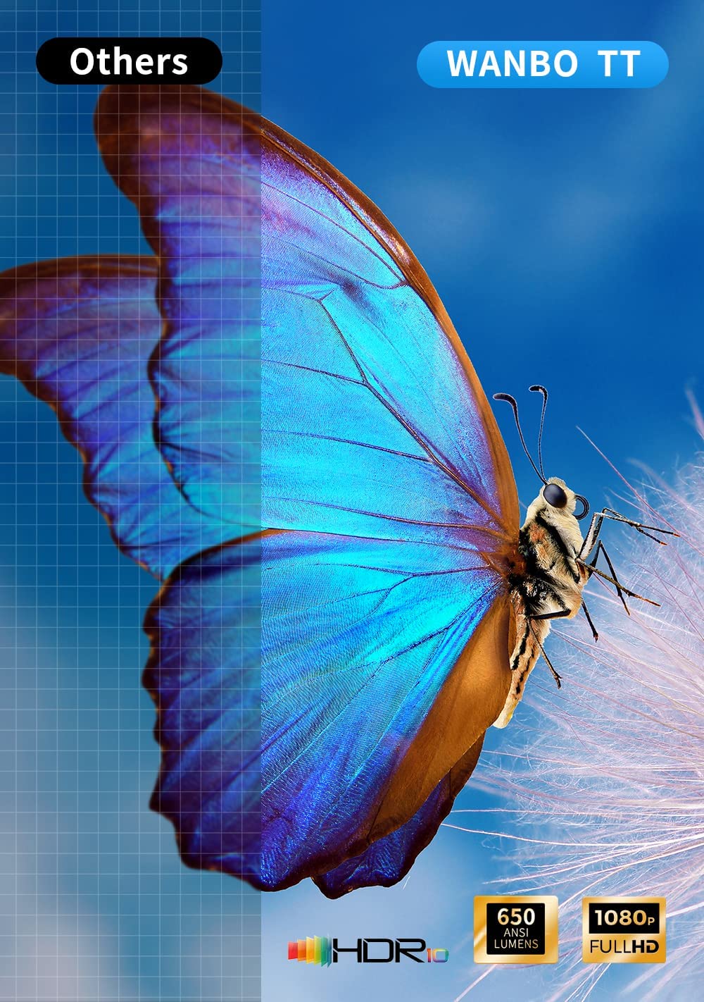 - Native 1080P& 650ANSI& HDR10 &UHD support 4K Projector: WANBO TT 4K Projector is the brightest 650 ANSI projector with detailed 1080P (1920*1080) images and HDR10 technology, providing high-quality images for watching your favorite movies. The WANBO mini projector delivers a brand-new user experience with more dynamic range and full image details. It also supports 4K ultra HD, giving you a high-quality home cinema experience.