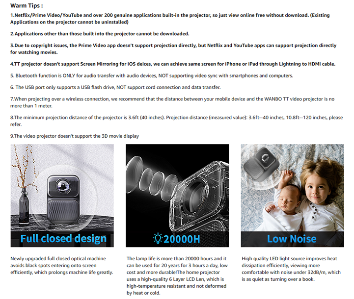 - Compatible with Multiple Devices& Professional Service : WANBO home video projector includes built-in USB, HDMI, and audio ports, allowing you to connect a USB disk, TV stick, iOS & Android phones, laptops, PCs, tablets, external speakers, PS5, and game consoles. The projector also comes with a one-year warranty for non-artificial damage from the date of purchase from this store. If you need any assistance, please do not hesitate to contact us, and we will promptly solve any issues.