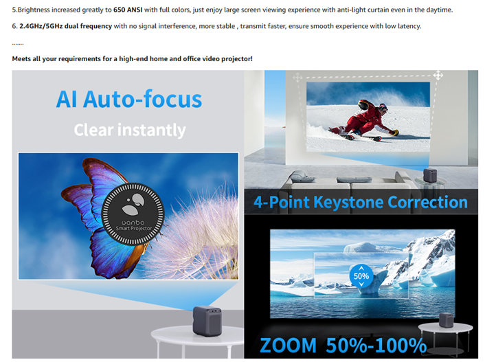 - Auto Focus Projector& 4P Keystone Correction& Zoom Function : WANBO Portable Projector is Self-developed AI focus algorithm with 9 directional gyro, finish auto-focus instantly and clear image keeps as it is. With the innovative 4D/4P Keystone correction,It can adjust Horizontal angles ±30° and support side projection, you could watch from almost every angle.With the ZOOM function, it can adjust image size from 50% to 100% display what size you want without moving the projector.