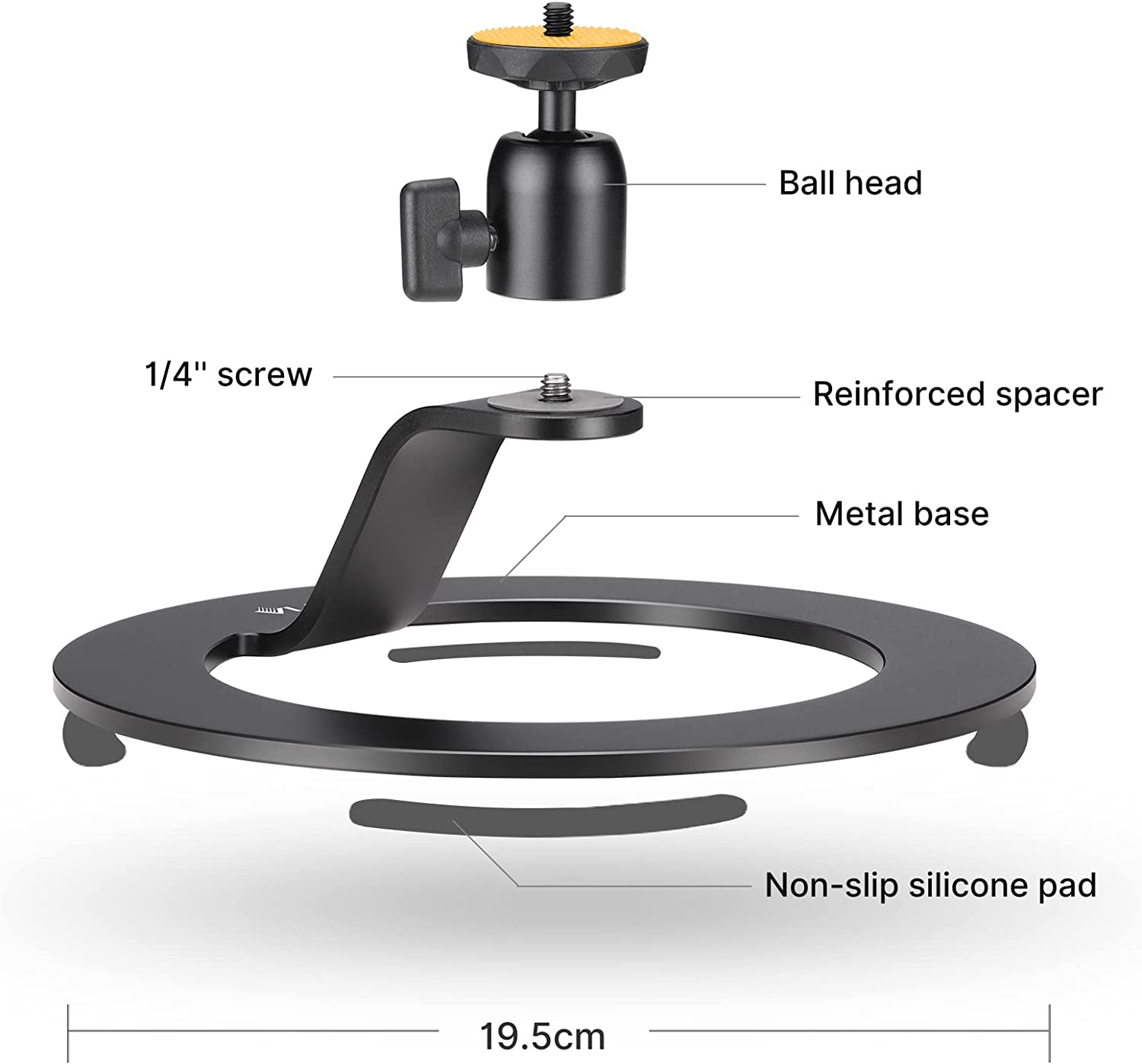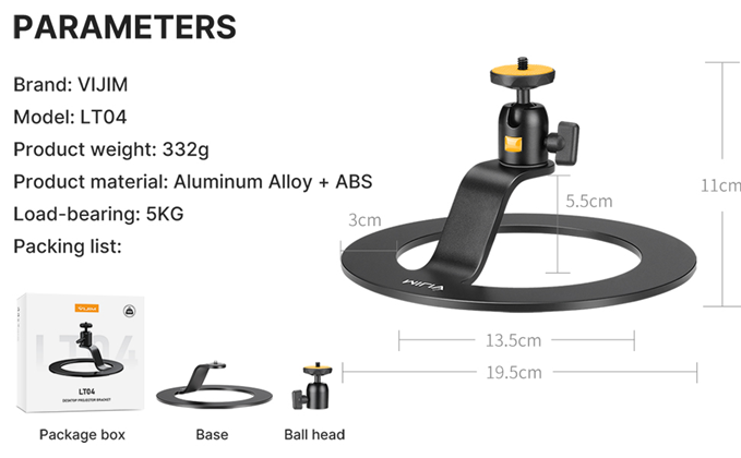 • The desktop projector stand base 19.5cm larger diameter, structural stability loading capacity 11.02 lb/5 kg is for projectors with 1/4in(6.35mm) Mounting Screw Thread.