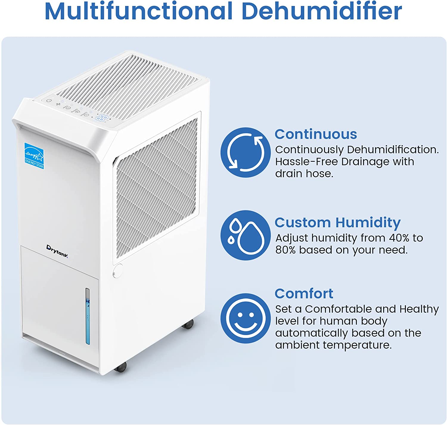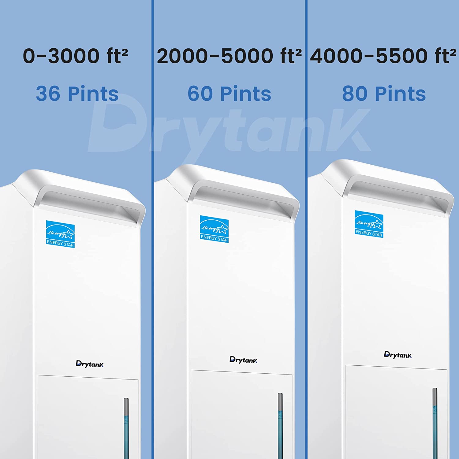 - POWERFUL MOISTURE ABSORPTION: 3,000 sq. ft dehumidifier for basement, removes 36 pints per day( 52 pints in 86°F, 80% RH). Customized control and continuous dehumidification mode design, Enjoy healthy air in 45%-55% humidity for home bathroom laundry garage bedroom crawlspace, etc