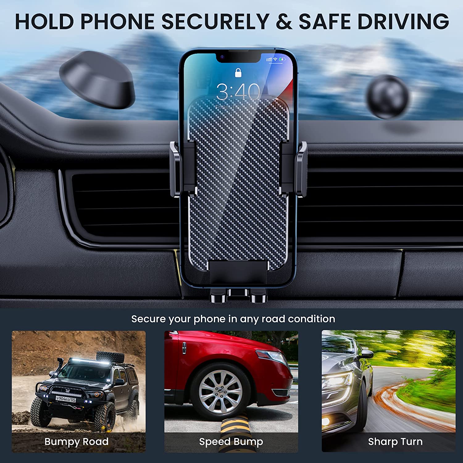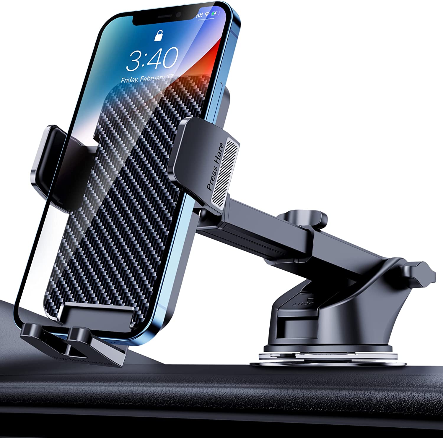 • Powerful Suction Cup: A 3M dashboard pad is included that provides a flat surface on which the phone mount can be secured permanently. An iPhone holder for car is equipped with super sticky suction and double lock design for smooth and stable mounting when driving NOTE: Dashboard pad should not be used for mounting on windshield