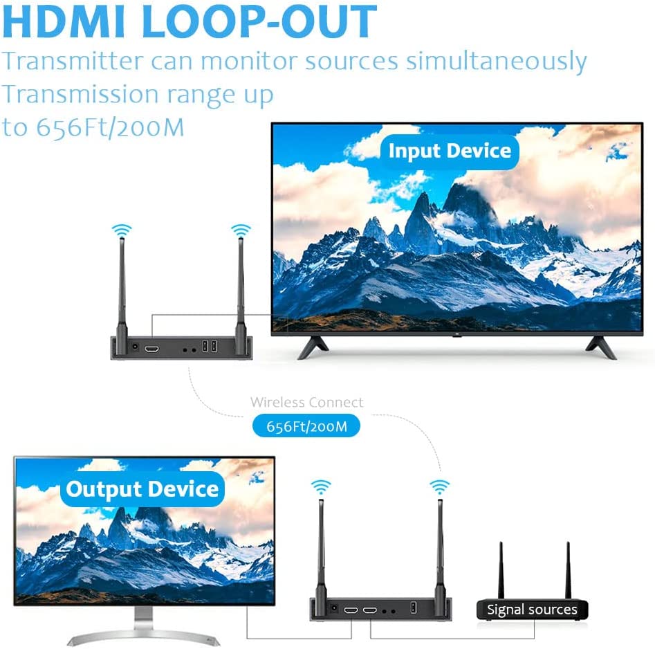 - 【Range up to 656ft/200m with 5.8G Transmission】 - This wireless hdmi extender is range up to 656ft/200m due to its 5.8G dual signal amplifier,as a low latency of 0.2 seconds.【Note】When used across the wall, the transmission distance will be shortened to 165ft/50m.