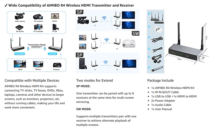 - 【Up to 8 Kits use in one location】 - Each pair of AIMIBO Wireless HDMI transmitter and receiver can be set with a independent channel to allow multiple extender kits to be used in the same environment without interference.