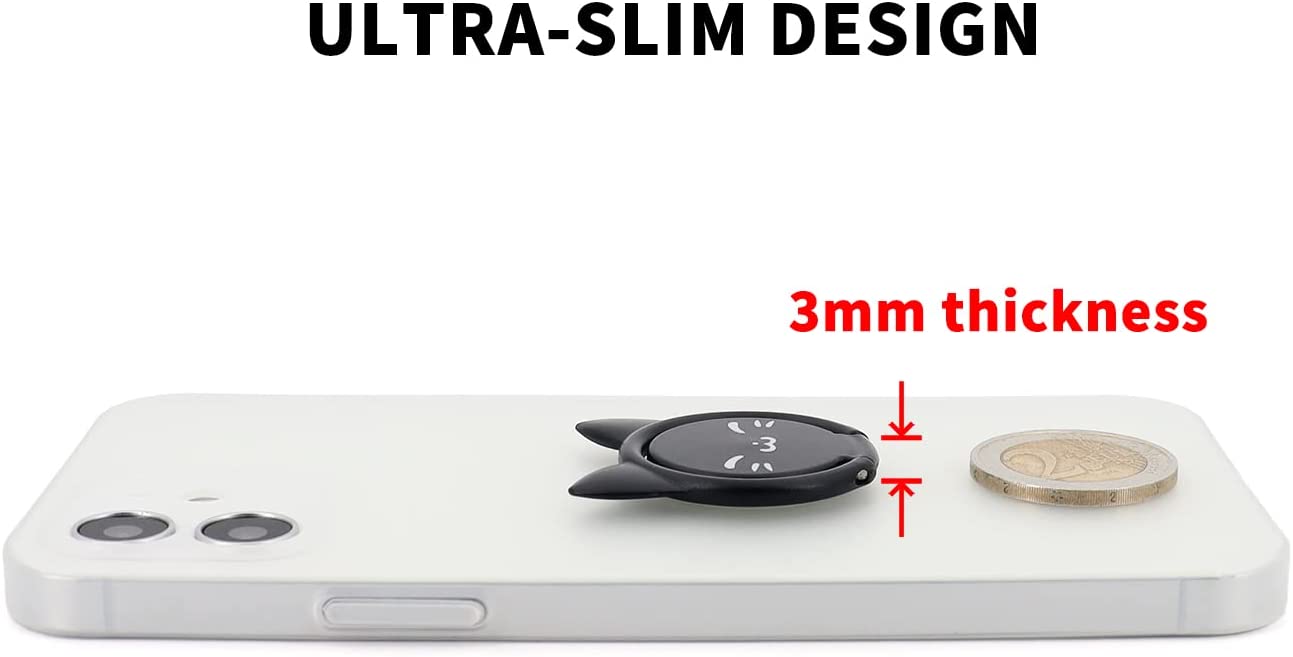 • Ultra-Slim Design: this cell phone ring holder's thickness is only 3mm and completely flat, so that it doesn't wobble around when you put your phone on a flat surface.