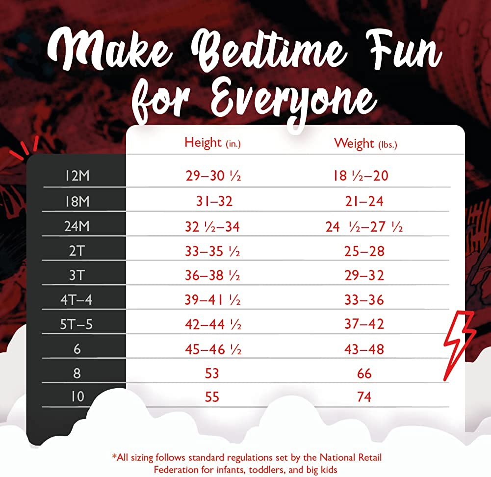 - BEDTIME FUN: These fun superhero pajamas for boys come in a variety of shirt-and-pants and shirt-and-shorts styles. Our supercool kids’ pajamas feature detailed graphics and bright colors and are available in sizes 12M–4T and 4–10.