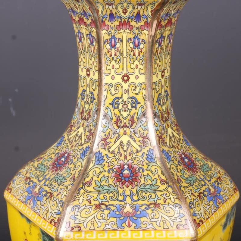 ZSEDP Jingdezhen Antique Enamel Hexagons Vase Yellow Flower and Bird Pattern Vase