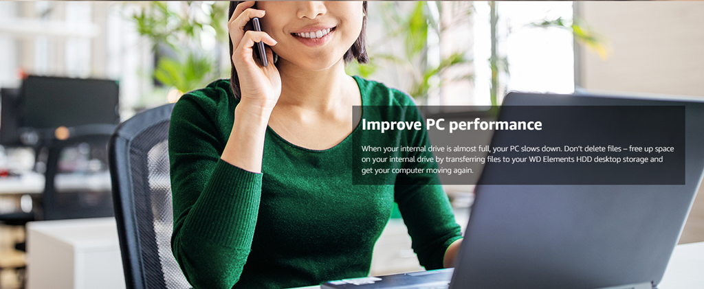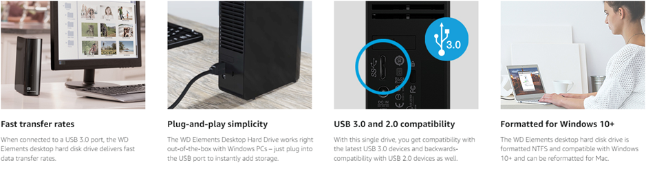 WD Elements desktop storage with USB 3.0 offers reliable, high-capacity, add-on storage, fast data transfer rates and universal connectivity with USB 3.0 and USB 2.0 devices. The sleek design features up to 18TB capacity plus WD quality and reliability. As used for storage capacity, one terabyte (TB) = one thousand GB. Total accessible capacity varies depending on operating environment.