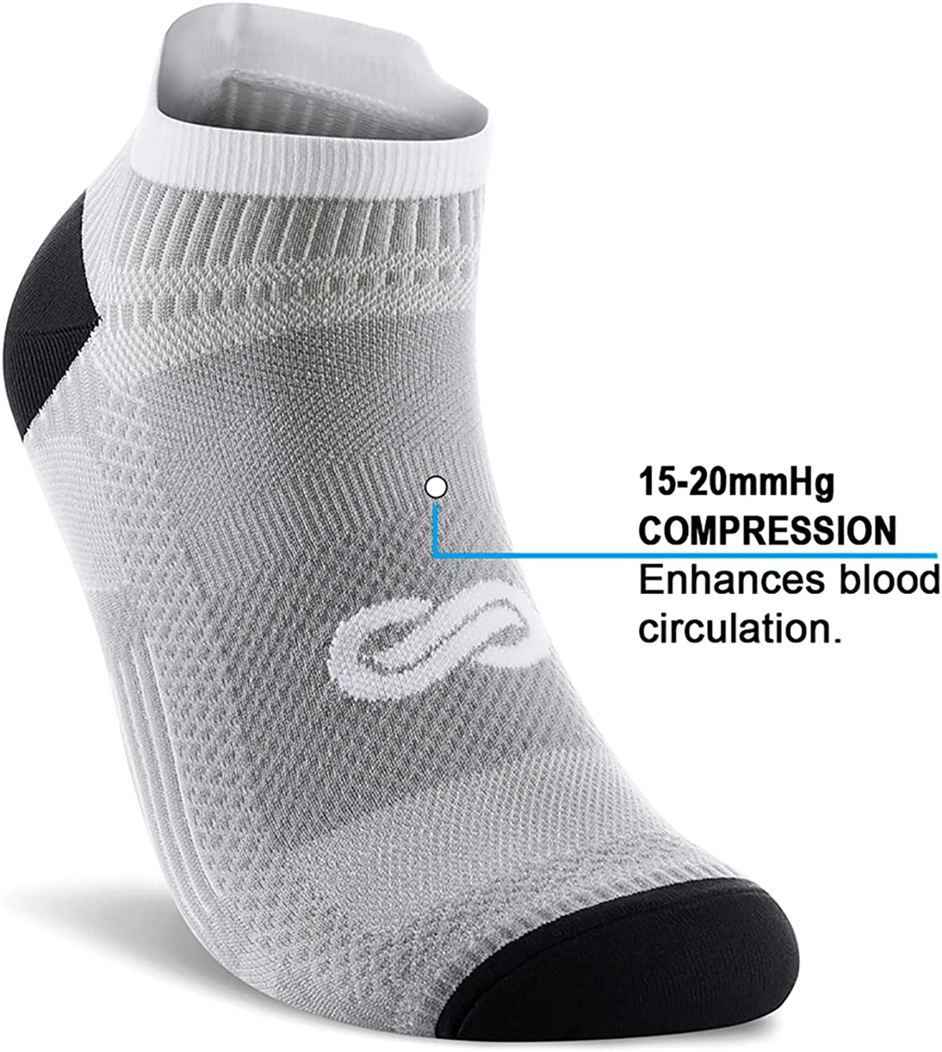 - [360 PROTECTION FOR YOUR FEET] The no show compression socks with 3d circular progressive pressure design provide you with permanent all-around protection, ensure your feet at the right angle to reduce sports injuries while providing ankle support