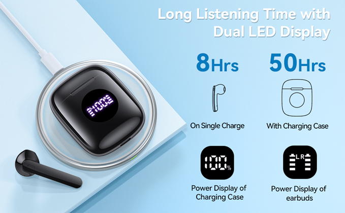 • 1.[Up to 50 Hours Playback with Wireless Charging Case] On single charge, CAPOXO N7 wireless earbuds last around 8 hours (at 50%-60% volume). With recharges provided by its compact charging dock, you can use them non stop for 50 hours. And the charging box works for wireless and plug in charging, making charging more convenient. Also the Built-in Dual LED power display allows you to grasp the remaining power of the charging case and the charging status of the earbuds in real-time.
