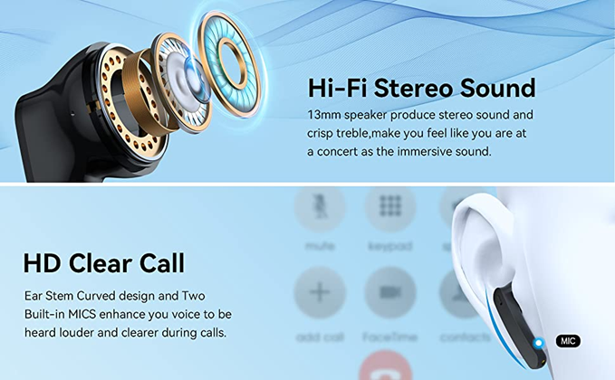 • 2.[Hi-Fi Clear Music & Talk] Engineered with 13-mm speaker driver, these Bluetooth headphones keep the sound crisp with deep bass, deliver an immersive sound experience. The curved design of the ear stem makes the built-in microphone closer to your mouth(to collect your voice effectively), which enhance phone calls performance greatly, let the other end can hear you clearly. Best choice for relaxing and business.