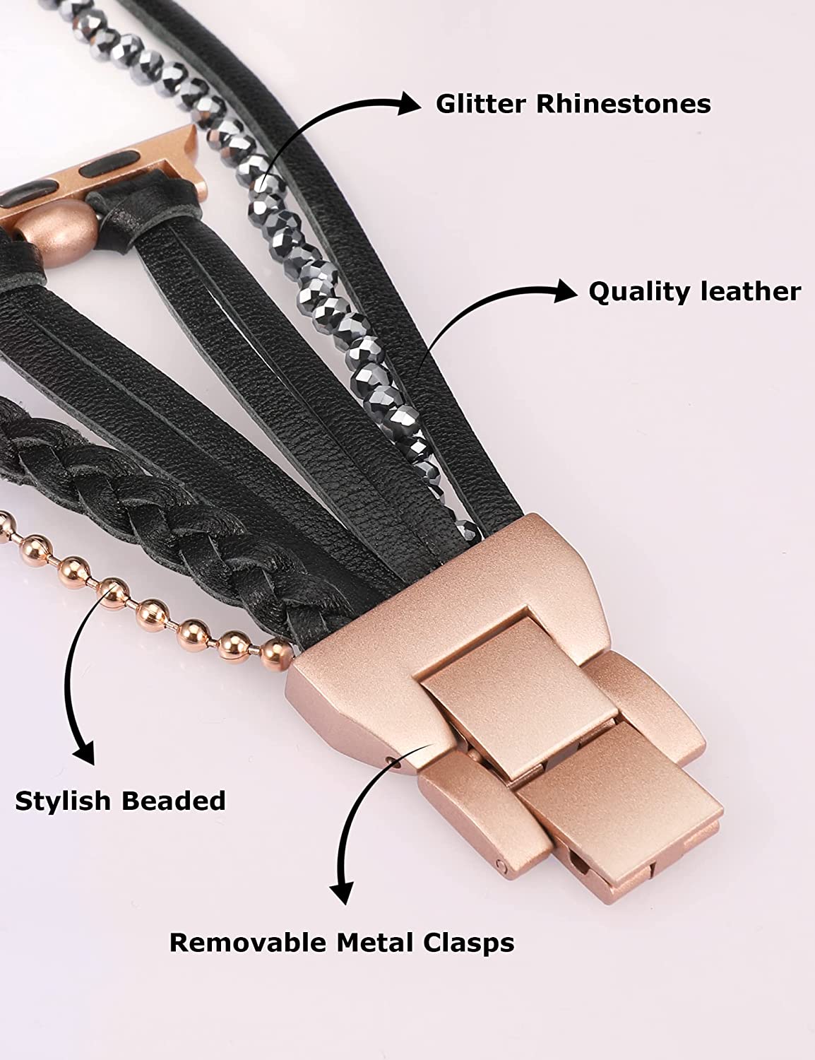Wearlizer Posh Leather Bands Compatible With Apple Watch Band 41mm 40mm 38mm Women, Boho Handmade Braided Beads Bracelets Multilayer Wrap Jewelry Strap For iwatch Series Ultra 8 7 6 5 4 3 2 1 Se