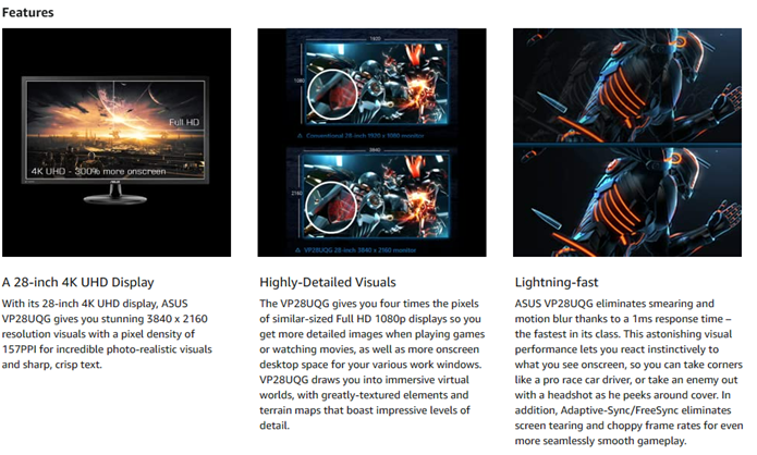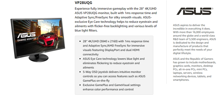 ASUS VP28UQG 28" 4K/UHD 3840x2160 1ms DP HDMI Adaptive Sync/FreeSync Eye Care Monitor