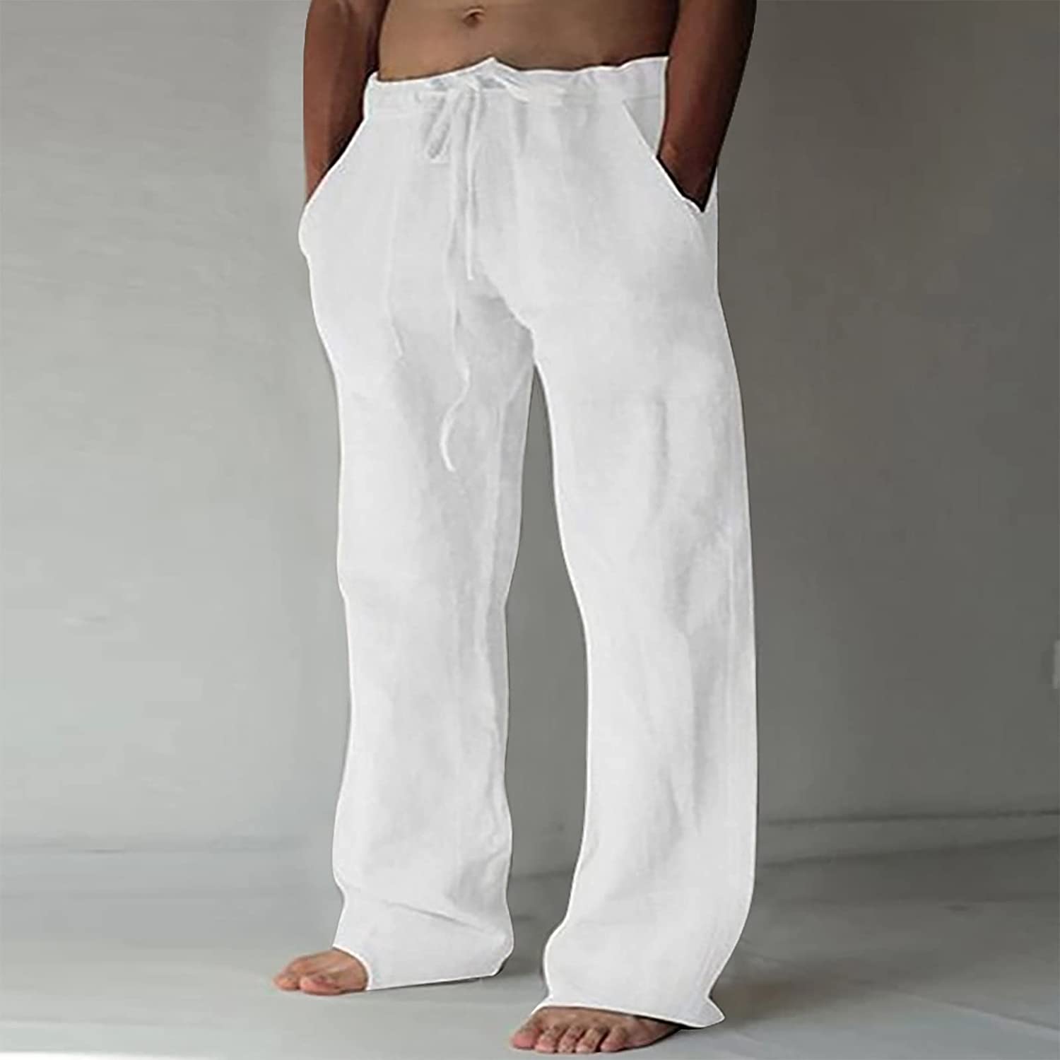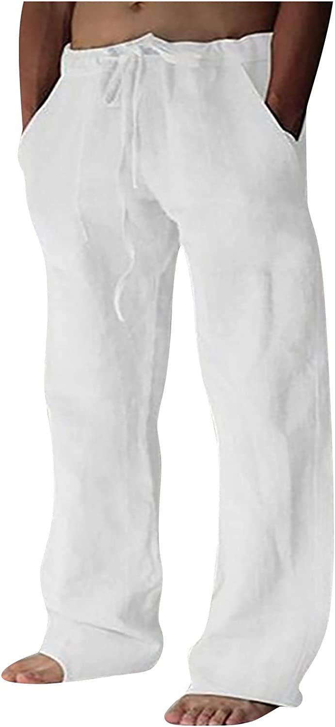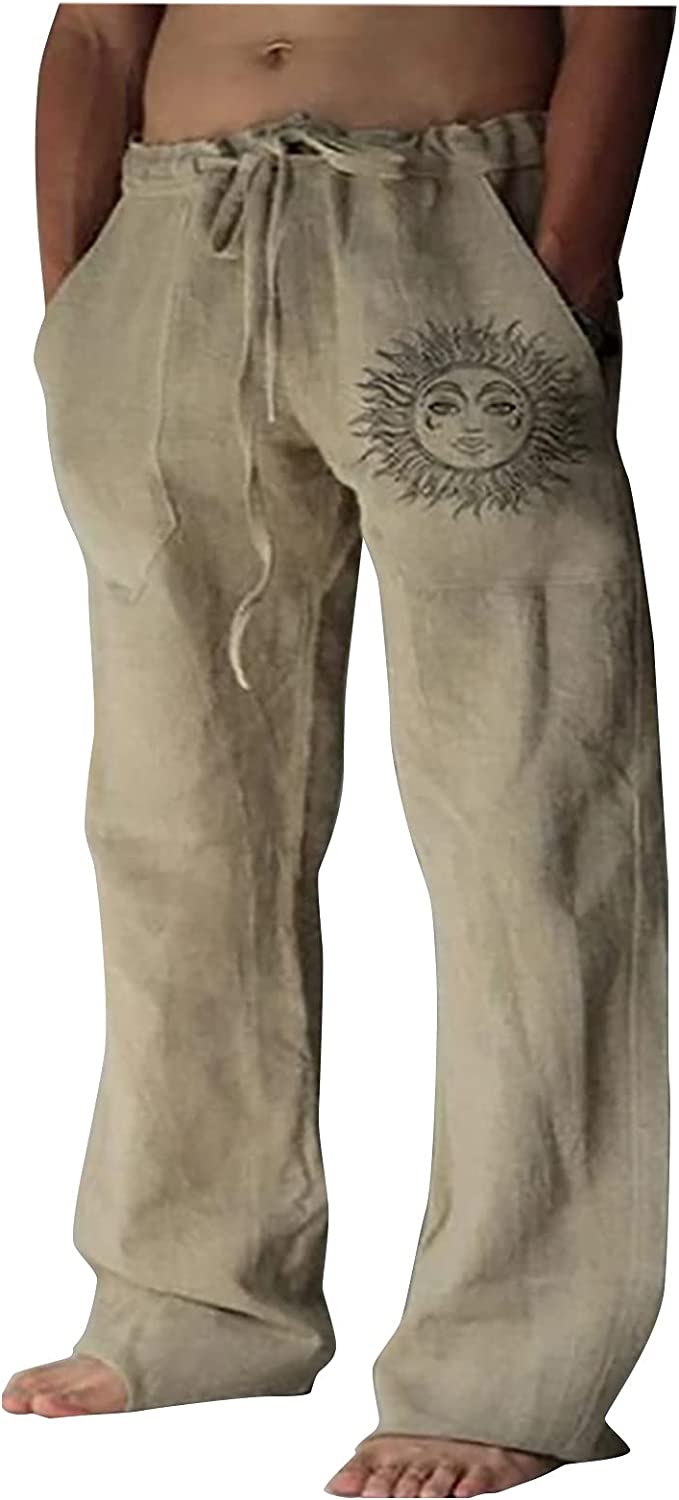 YKARITIANNA Casual Cotton Linen Pants Men,Basic Midweight Drawstring Quick Dry Loose Comfy Slacks,Printed Waistband Trousers