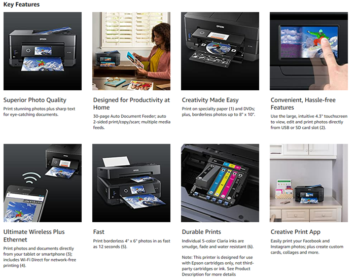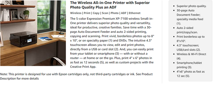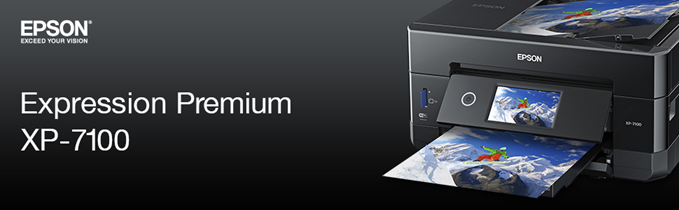 The 5 color expression Premium XP 7100 wireless Small in One printer delivers superior photo quality and versatility, ideal for productive, creative families. Save time with a 30 page auto document feeder and auto 2 sided printing, copying and scanning. Print vivid, borderless photos up to 8" X 10", or on specialty paper1 and dads. The intuitive 4. 3" Touchscreen allows you to view, edit and print photos, directly from a USB or card slot2. And, you can easily Print from your tablet or smartphone3 — with or without a router — at home or on the go. Plus, Print 4" X 6" Photos in as fast as 12 seconds5, as well as custom projects with the creative Print app This Epson printer is designed for use with only genuine Epson brand cartridges. Other brands of ink cartridges and ink supplies are not compatible and, even if described as Compatible, may not function properly or at all. Epson provides information about the design of the printer on the box and in many other locations and materials Included with the printer and on the website. Epson periodically provides firmware updates to address issues of security, performance, minor bug fixes and ensure the printer functions as designed. This printer was designed to work only with genuine Epson ink cartridges and some updates may affect the functionality of third party ink. Non epson branded or Altered Epson cartridges that functioned prior to a firmware update may not continue to function. * this product uses only genuine Epson brand cartridges. Other brands of ink cartridges and ink supplies are not compatible and, even if described as Compatible, may not function properly. Black and color print speeds are measured in accordance with ISO/IEC 24734. Actual print times will vary based on factors including system configuration, software, and page complexity. For more information- binational/Print speed 1 specialty paper support accommodated through rear paper feed, maximum 23 Mil paper thickness, manual 2 sided printing only. 2 adapter may be required. 3 Most features require an Internet connection to the printer, as well as an Internet and/or email enabled device. Wi fi Direct may require printer software. 5 color photo in draft mode on premium photo paper glossy measured from start of paper feed. Actual print times will vary based on factors including system configuration, software, and page complexity. For more information, binational/Print speed 6 smudge, scratch, water and fade resistant on Epson photo papers. For CDs/DVDs, resistant only on specially treated discs. 7 for convenient and reasonable recycling options, smart Way is an innovative partnership of the U. S. Environmental Protection Agency that reduces greenhouse gases and other air pollutants and improves fuel efficiency. This Epson printer is designed for use with only genuine Epson brand cartridges. Other brands of ink cartridges and ink supplies are not compatible and, even if described as compatible, may not function properly or at all. Epson provides information about the design of the printer on the box and in many other locations and materials included with the printer. Epson periodically provides firmware updates to address issues of security, performance, minor bug fixes and ensure the printer functions as designed. This printer was designed to work only with genuine Epson ink cartridges and some updates may affect the functionality of third party ink. Non Epson branded or altered Epson cartridges that functioned prior to a firmware update may not continue to function. Rated Voltage - 100 – 120 VAC.
