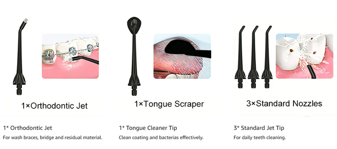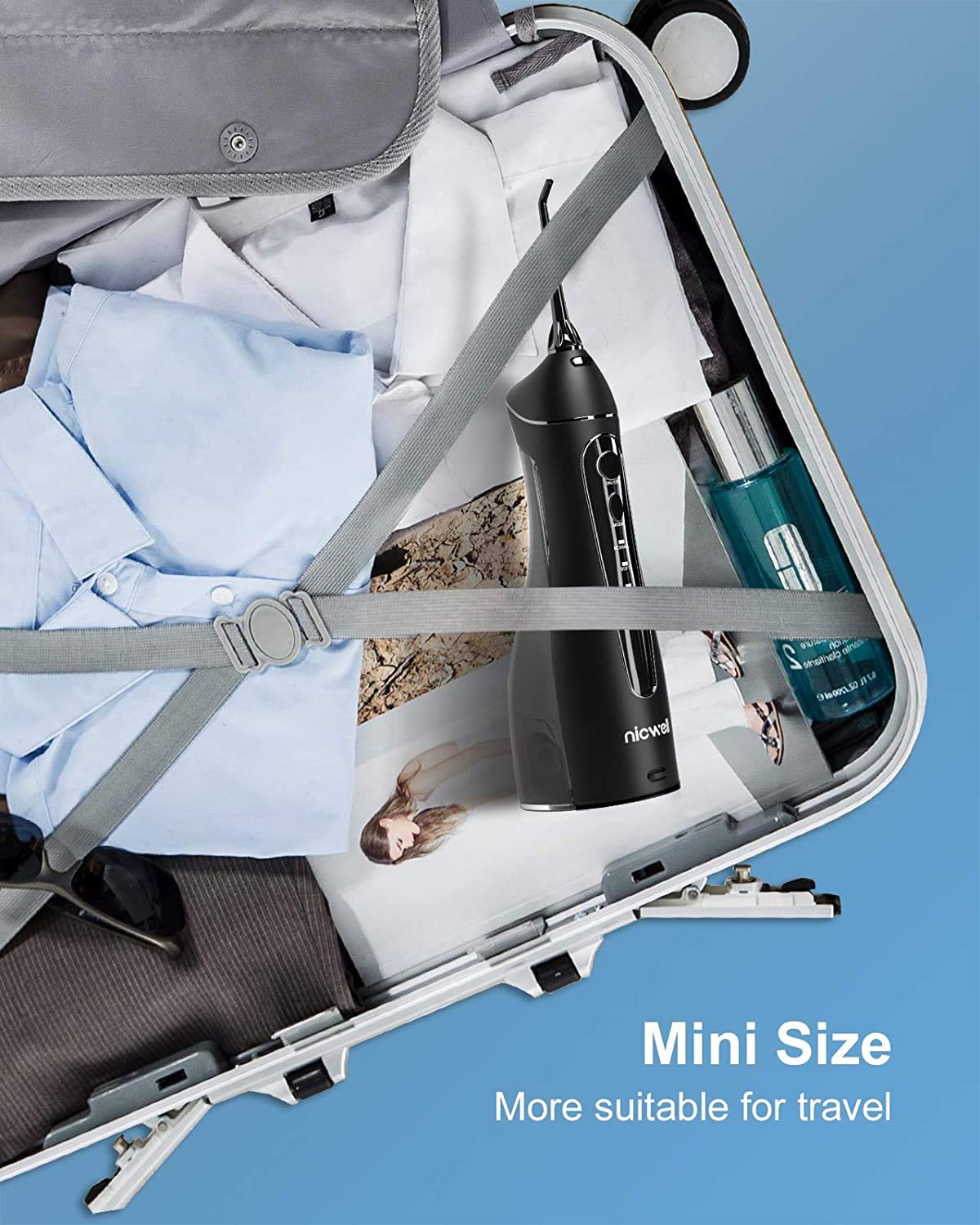 • CARRY ON SIZE: Cordless & small size, this water teeth cleaner picks is ideal for travel, 5 interchangeable jet tips included for your whole family. The 360°rotatable nozzle allows you to easily clean areas that are difficult to reach and prevents tooth decay, dental plaque,dental calculus,gingival bleeding and dental