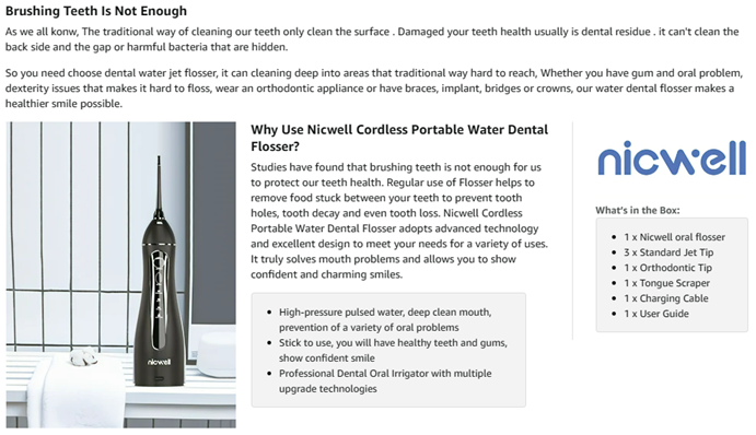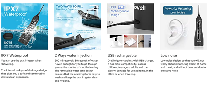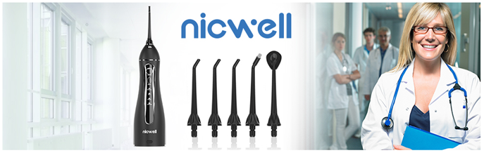 • POWERFUL BATTERY LIFE & IPX7 WATERPROOF: With powerful and environmental lithium battery, fully charged need 4 hours and used continuously for about 21 days. Come with USB Cable(Adapter Not Included) applicable to a variety of charging equipements such as power bank, computer, laptop.... With double-sealing rings, Nicwell oral irrigator prevent water leakage reliably, can use for shower in the bathroom and it's washable to clean